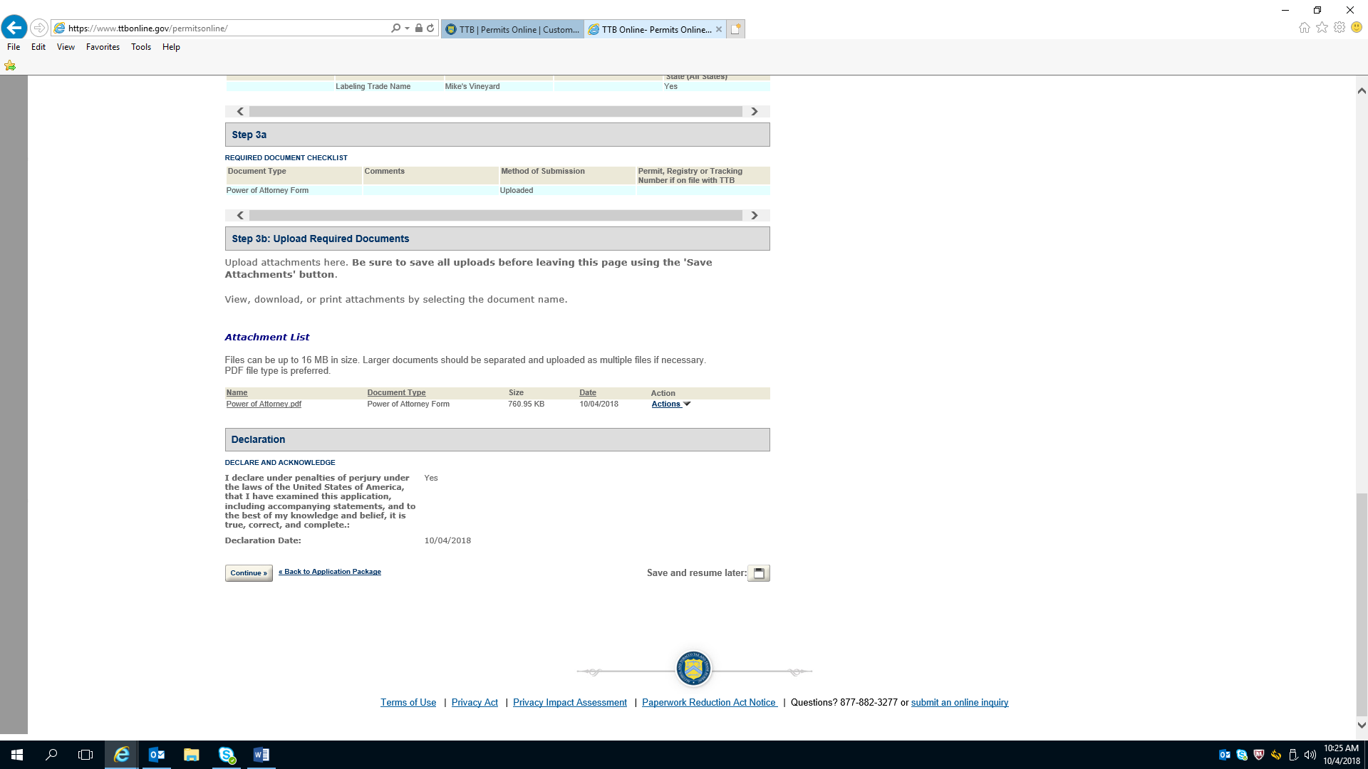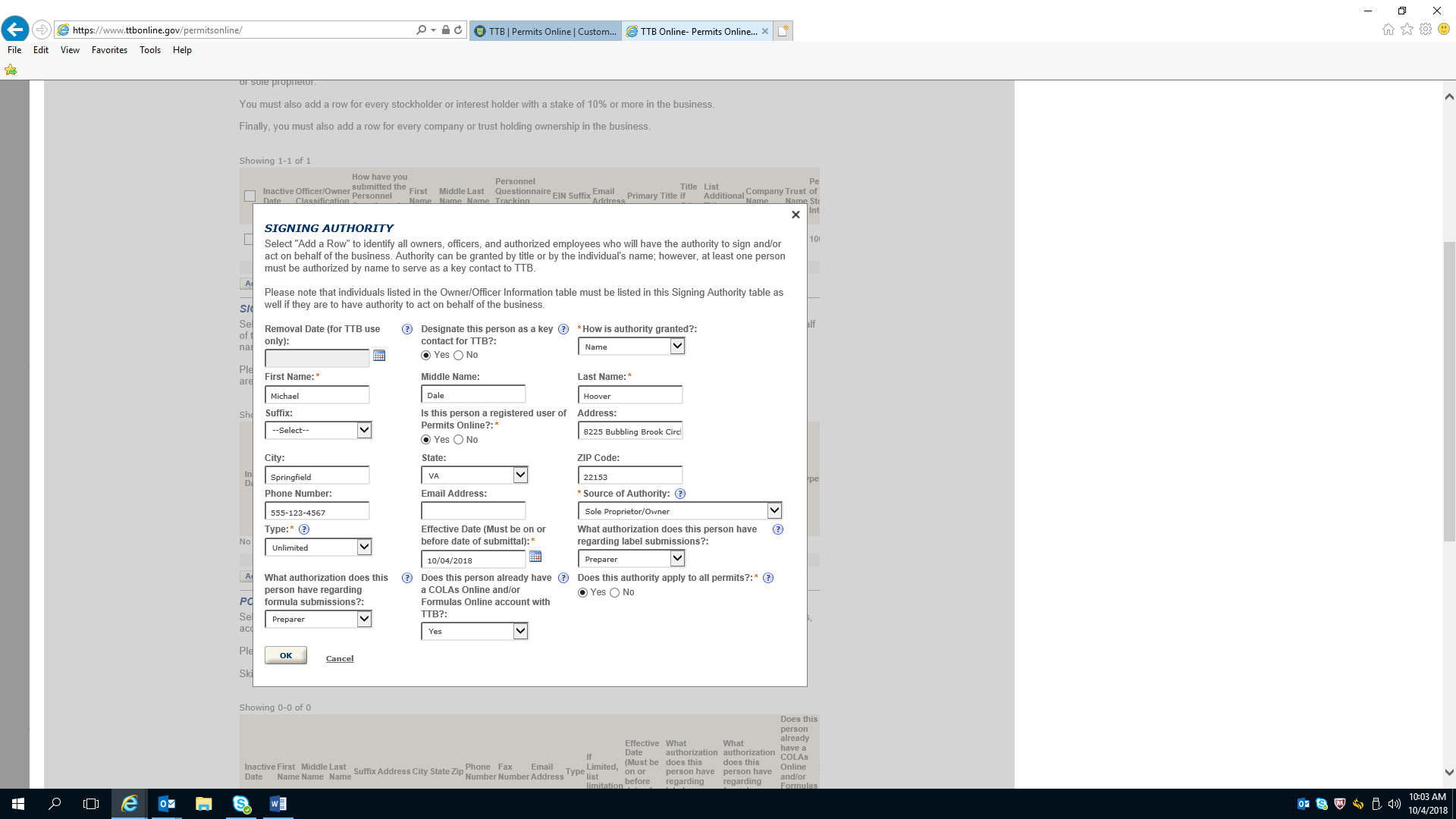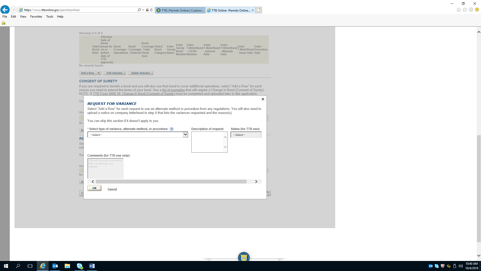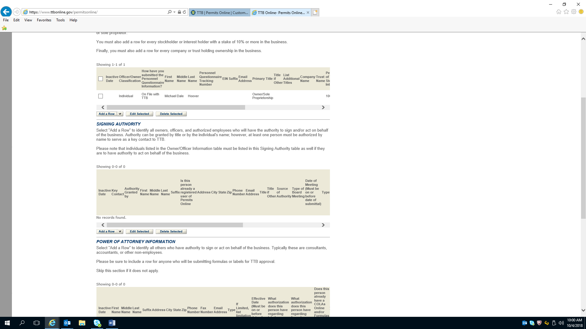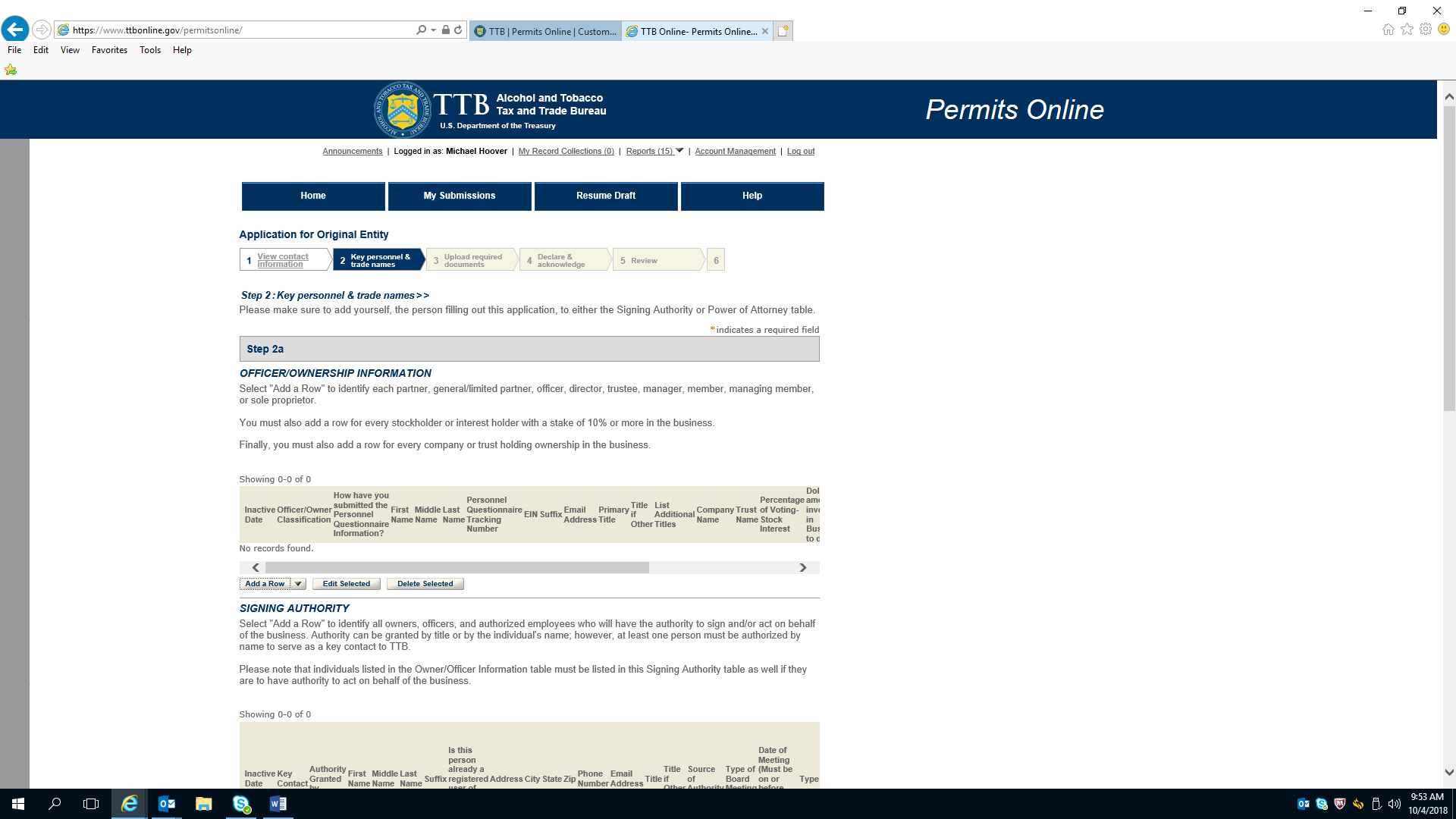 Permits Online Screen Shots — New DSP or Bonded Wine Premises FAA Act Basic Permit Applications (OMB Control No. 1513–0018) (10-2018)
