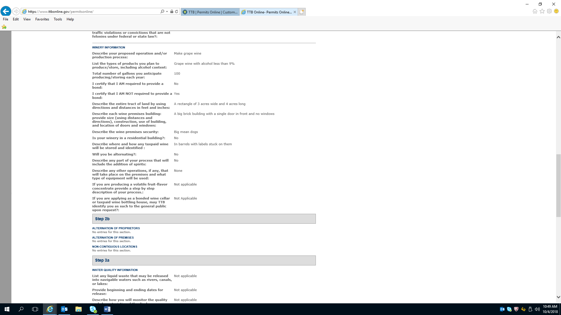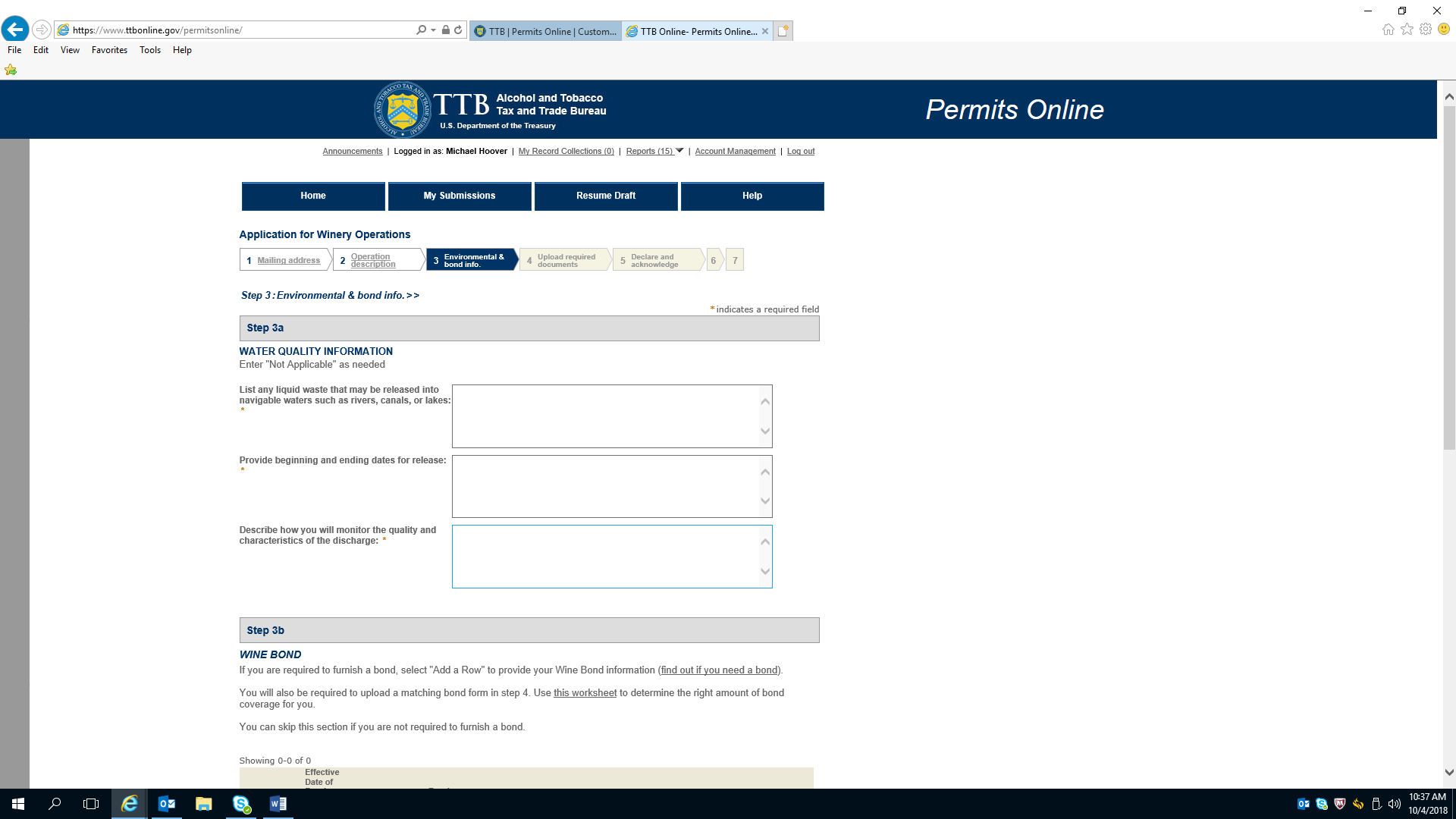 Application for Winery Operations—Environmental & Bond Info (continued)