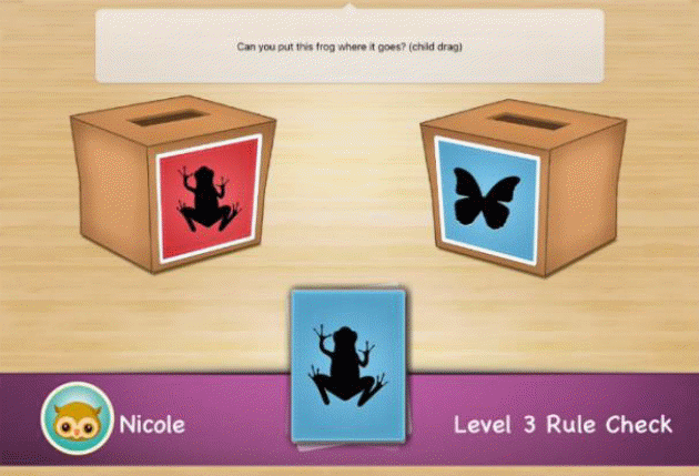 This image shows a screenshot of how the MEFS would appear on a child's technical device. The image includes a speech bubble at the top that reads, "Can you put this frog where it goes?” with a prompt for the child to drag the image to the correct box. There are two boxes that each have a slot at the top and a picture on the front. The left box shows a picture of a black frog on a red background, and the right box shows a picture of a black butterfly on a blue background. Between these two boxes, the top card on a stack of cards shows a picture of a black frog on a blue background. At the bottom of the image is a purple ribbon where the child's name and MEFS avatar (an owl) is in the lower left corner and the words, “Level 3 Rule Check,” are in the lower right corner.