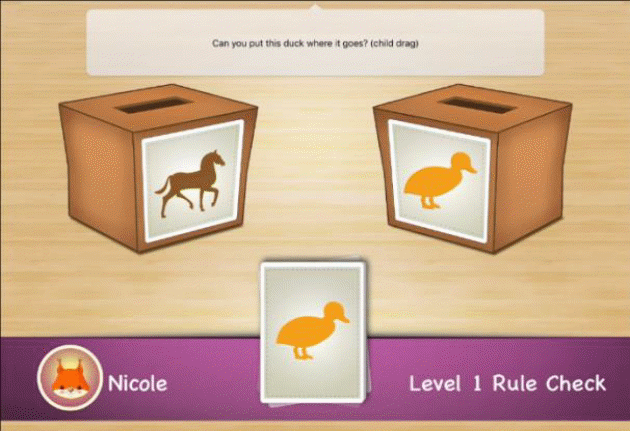 This image shows a screenshot of how the MEFS would appear on a child's technical device. The image includes a speech bubble at the top that reads, "Can you put this duck where it goes?” with a prompt for the child to drag the image to the correct box. There are two boxes that each have a slot at the top and a picture on the front. The left box shows a picture of a brown horse, and the right box shows a picture of an orange duck. Between these two boxes, the top card on a stack of cards shows a picture of an orange duck. At the bottom of the image is a purple ribbon where the child's name and MEFS avatar (a fox) is in the lower left corner and the words, “Level 1 Rule Check,” are in the lower right corner.