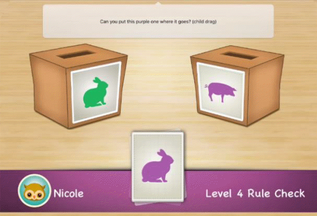 This image shows a screenshot of how the MEFS would appear on a child's technical device. The image includes a speech bubble at the top that reads, "Can you put this purple one where it goes?” with a prompt for the child to drag the image to the correct box. There are two boxes that each have a slot at the top and a picture on the front. The left box shows a picture of a green rabbit, and the right box shows a picture of a purple pig. Between these two boxes, the top card on a stack of cards shows a picture of a purple rabbit. At the bottom of the image is a purple ribbon where the child's name and MEFS avatar (an owl) is in the lower left corner and the words, “Level 4 Rule Check,” are in the lower right corner.