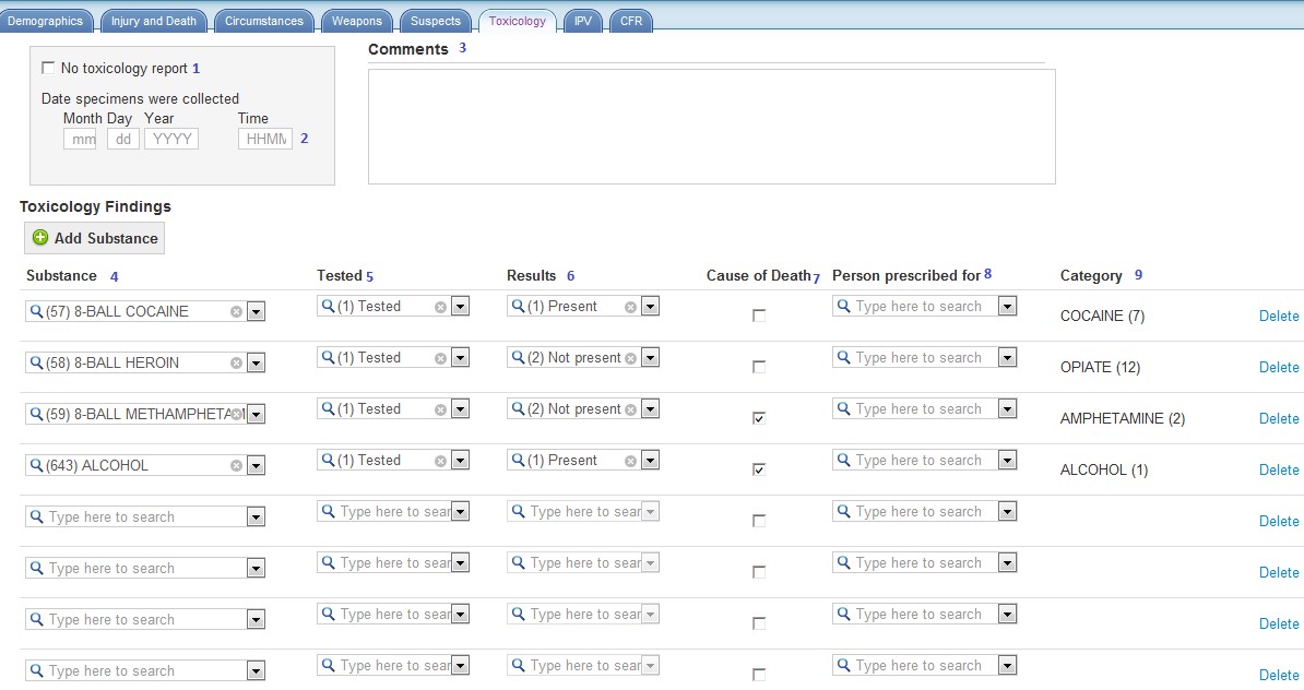 1 No Toxicology Available 7 SubstanceCausedDeath 2 SpecimensTime 8 DrugObtainedFor 3 Comments 9 SubstanceClass 4 SubstanceName 5 SubstanceTested 6 SubstanceResult