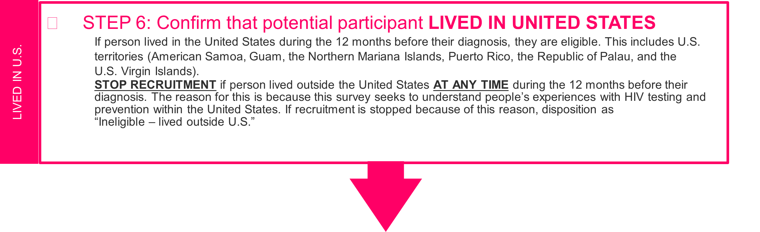 Recruiter: Thank you for that information. The last thing we need to know to find out if you are eligible is where you lived in the year before you were diagnosed with HIV. In the 12 months before you received your HIV diagnosis, were you living in the United States?