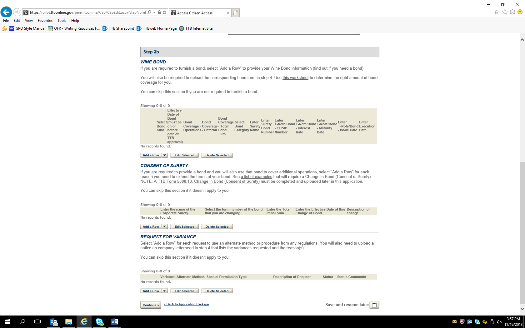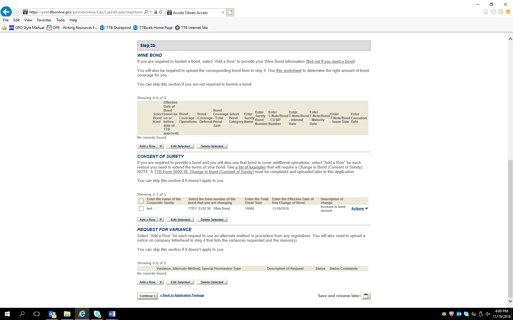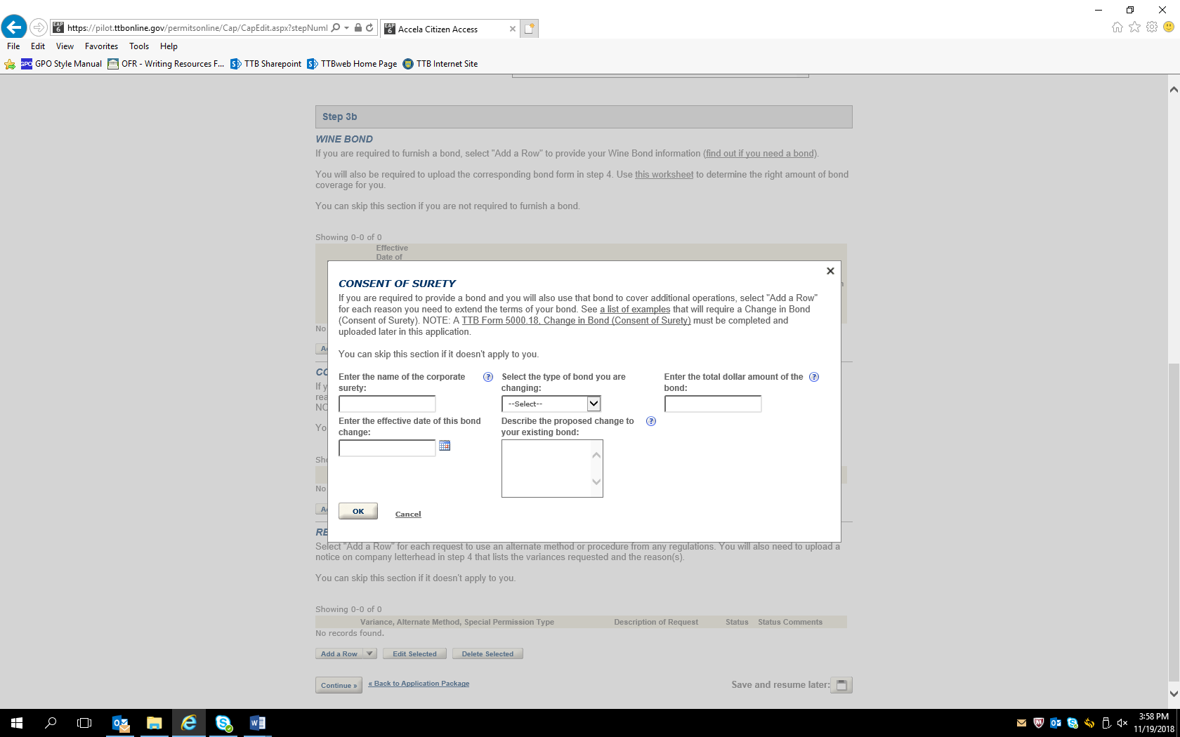Each PONL application includes a Bond / Consent of Surety / Request for Variance screen. When including a TTB F 5000.18 as an attachment to an application, the respondent will provide information regarding the change(s) to a bond and the consent of the surety to the change(s) on this screen by selecting “Add a Row” within the Consent of Surety section of the screen: