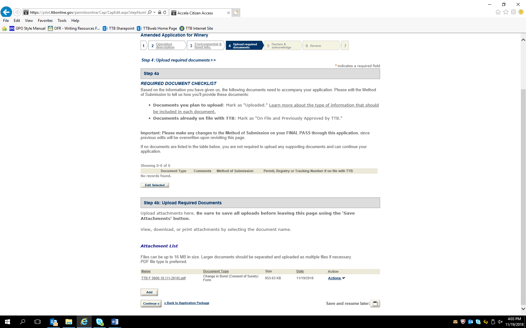 The user submits the application with the attached TTB F 5000.18 to TTB by clicking “continue,” reviewing the submitted information on a subsequent review screen, and then clicking “Submit” on the final screen (Review and Submit screens not shown.)