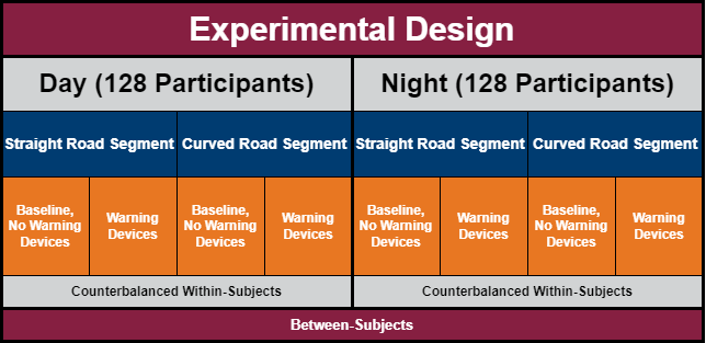 Understand driving behaviors (reaction time) with and without warning devices under day/night and straight/curved road conditions. |