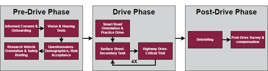 Information collections (ICs) will consist of (1) an eligibility criteria screening, (2) the informed consent form for the research study, (3) IRS W-9 form as required to comply with tax requirements, (4) a basic hearing test, (5) a basic visual acuity and color vision screening, (6) a brief demographics survey, (7) a risk propensity questionnaire, (8) instrumented vehicle sensors, an eye-tracking device, GPS equipment, and video cameras, all of which collect data automatically during a driving study, (9) an acknowledgement form, (10) a post-experiment survey, and (11) compensation exchange.