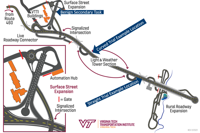 Figure 1 Map of the VTTI Smart Road with labels highlighting experimental locations.