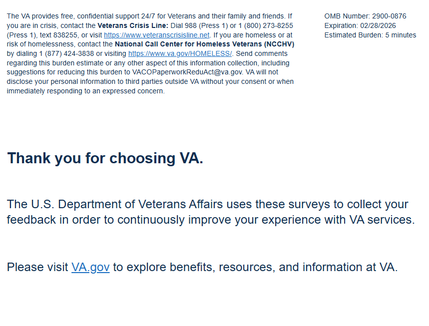 Privacy Notice: By filling out this survey, you are authorizing VA database access to retrieve Veteran contact information to follow up with you accordingly for purposes of service recovery, potential crisis, or to learn more about feedback you have shared regarding your experience with VA. Your contact information and response may be referred to the Veterans Crisis Line if an automated review indicates your response may be concerning. The Veterans Crisis Line may contact you for follow up as a result of that referral. VA may utilize individual Veteran survey data from this survey or other sources to ensure the final scores truly and accurately represent the experiences of Veterans. This collection of information is authorized by 38 U.S.C. Section 301. The Systems of Records Notice can be found here: https://www.federalregister.gov/d/2021-01526.