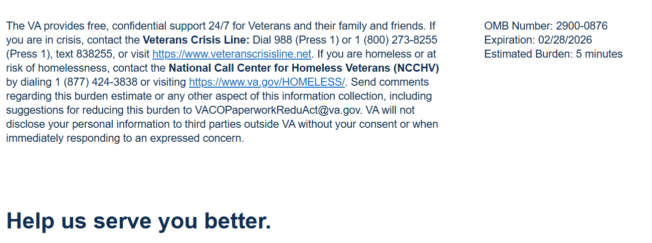 Respondent Burden: An agency may not conduct or sponsor, and a person is not required to respond to, a collection of information unless it displays a currently valid OMB control number. The OMB control number for this project is 2900-0876, and it expires 02/28/2026. Public reporting burden for this collection of information is estimated to average 5 minutes per respondent, per year, including the time for reviewing instructions, searching existing data sources, gathering, and maintaining the data needed, and completing and reviewing the collection of information. Send comments regarding this burden estimate and any other aspect of this collection of information, including suggestions for reducing the burden, to VA Reports Clearance Officer at VACOPaperworkReduAct@va.gov. Please refer to OMB Control No. 2900-0876 in any correspondence. Do not send your completed VA Form to this email address.