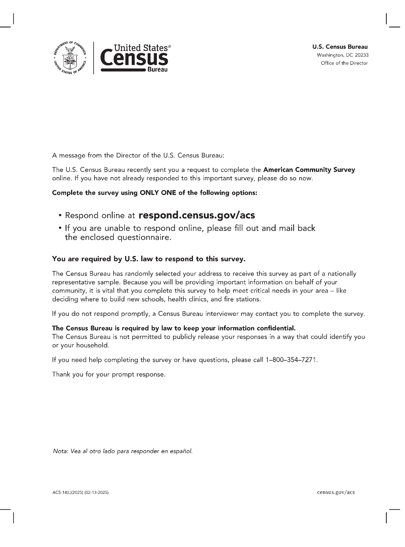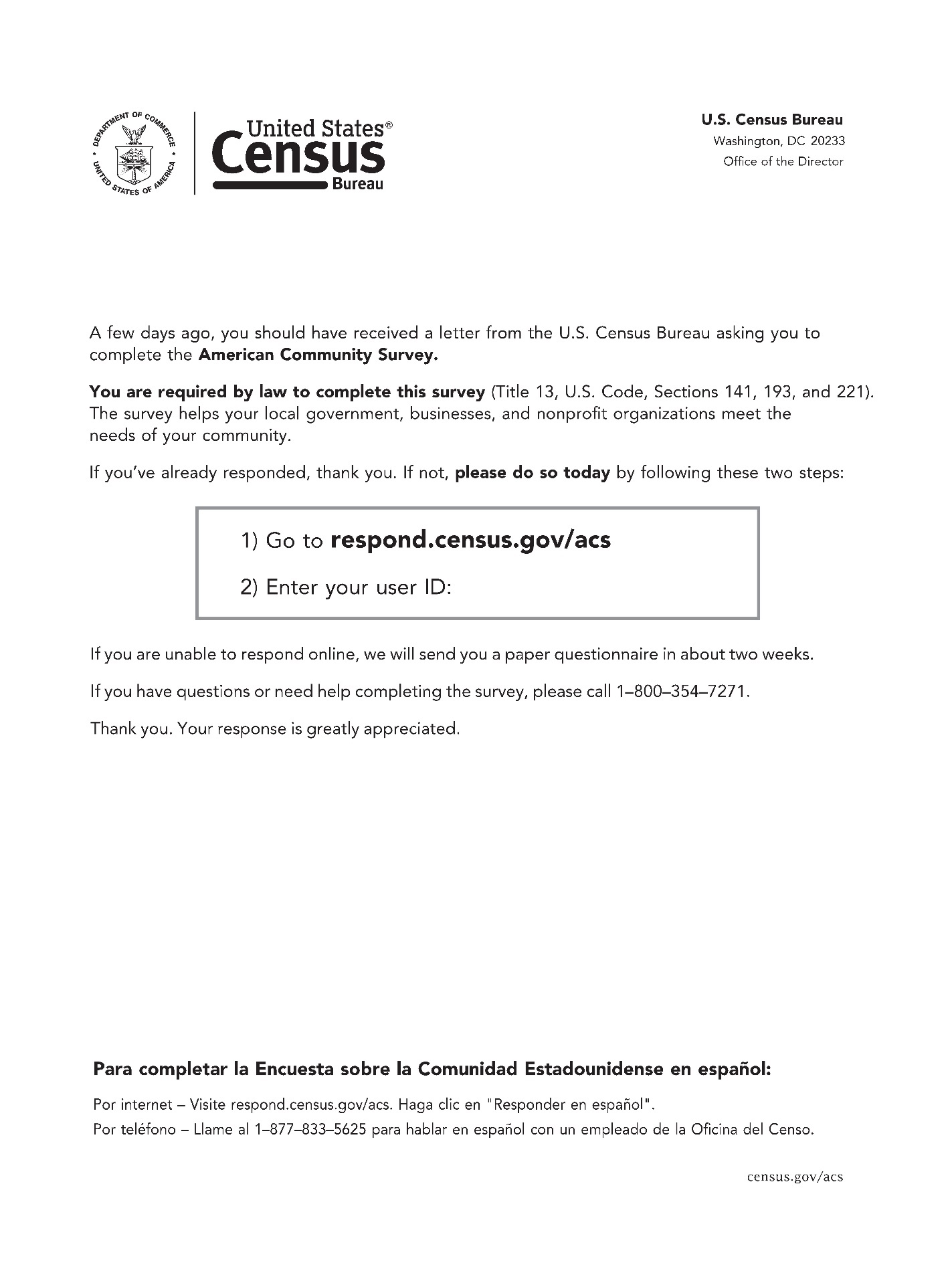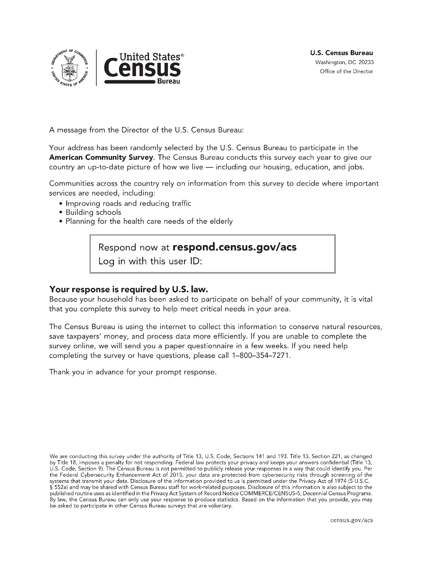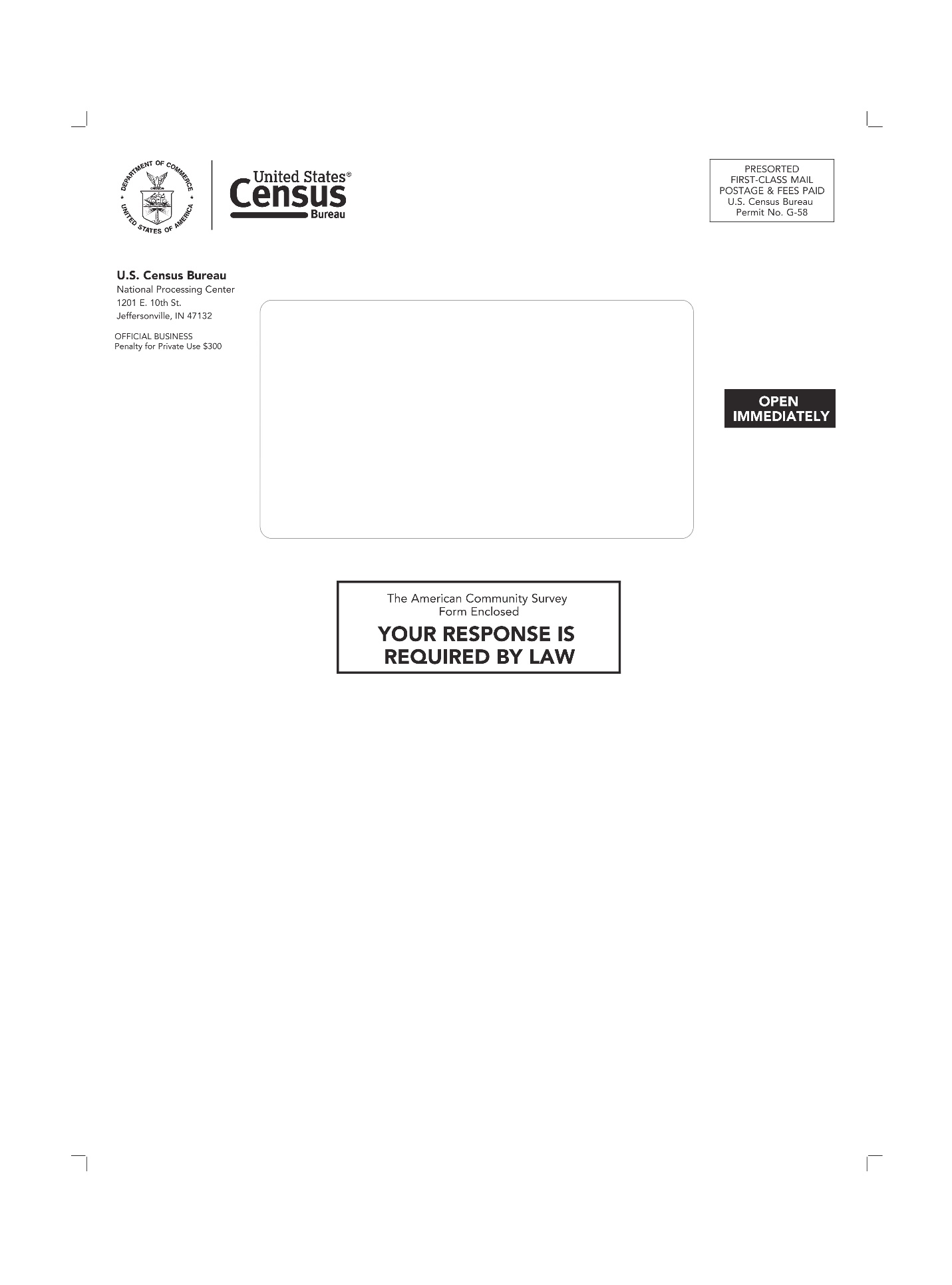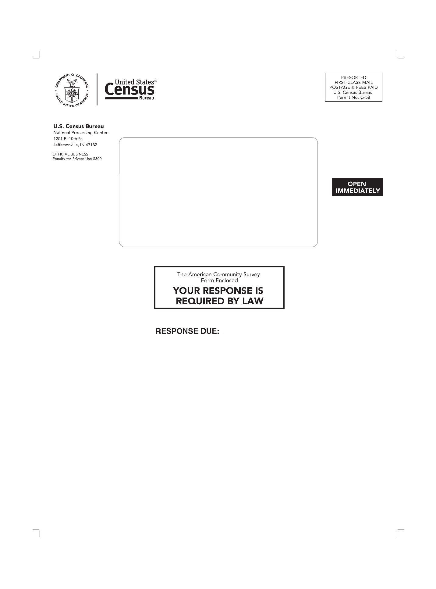 The Census Bureau sends the first two mailings to all mailable addresses in the monthly sample. These addresses comprise the initial mailing universe (M1). The first mailing is an initial pressure seal mailer that includes an internet user ID and instructions for how to respond online. It also provides the Telephone Questionnaire Assistance (TQA) phone number which respondents can call if they have questions or need help. A week later, the same addresses are sent a second mailing – a reminder pressure seal mailer.