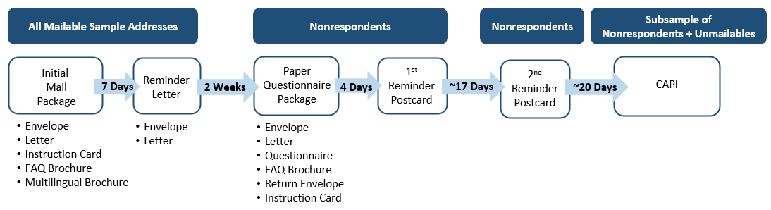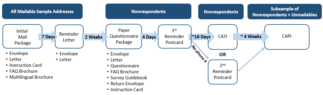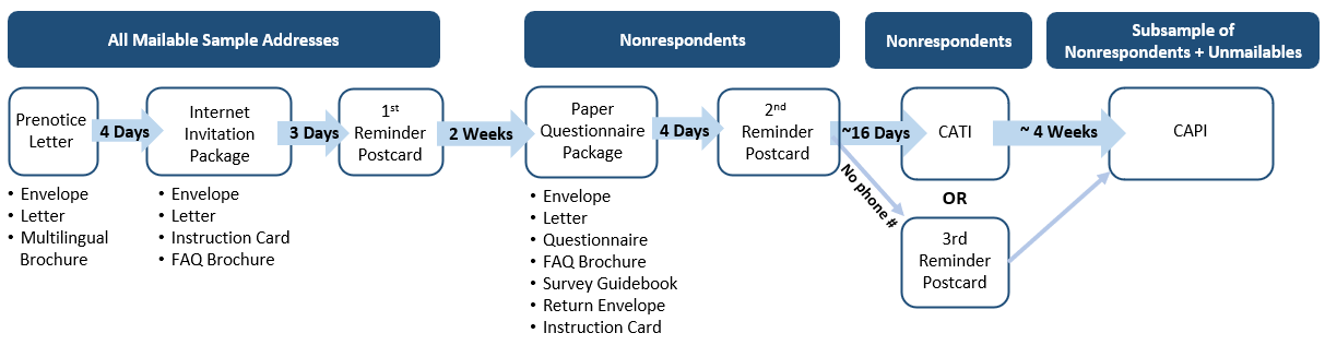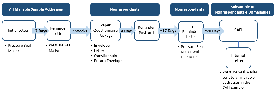 Figure 2 shows the ACS mail contact strategy before the internet response mode was introduced. The ACS program developed the original (2005) ACS mail contact strategy based on the 2000 Census mailing strategy, which included three mailings (prenotice letter, paper questionnaire package, and reminder postcard) followed by a nonresponse follow-up operation. The ACS program made some changes to this strategy, including tailoring language to reflect the survey and mandatory message, shortening the time between the first three mailings, and adding a second questionnaire mailing to nonrespondents.5 The contact strategy also included a Computer-Assisted Telephone Interview (CATI) operation that called nonrespondent households with telephone numbers available to elicit a response before the CAPI operation.