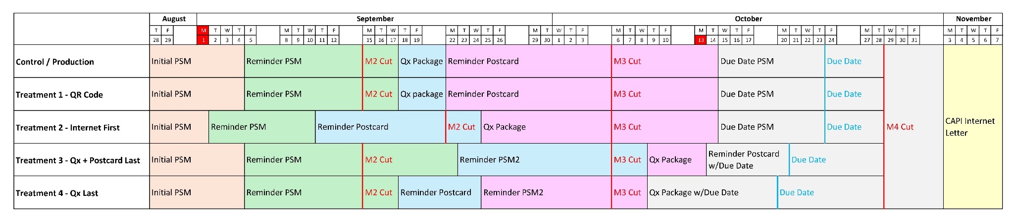 Figure 32 shows a timeline of each treatment. It shows the day each mail piece will be mailed as well as the days new mail universes will be created (i.e., the mail universe cut date).