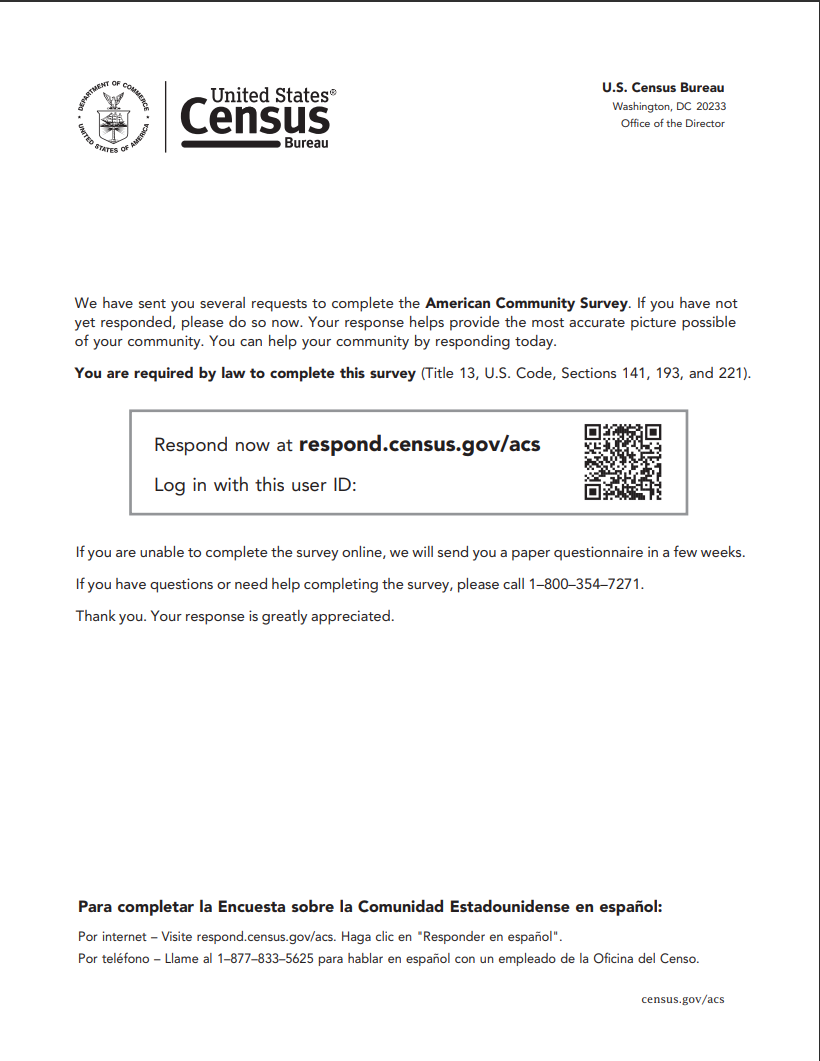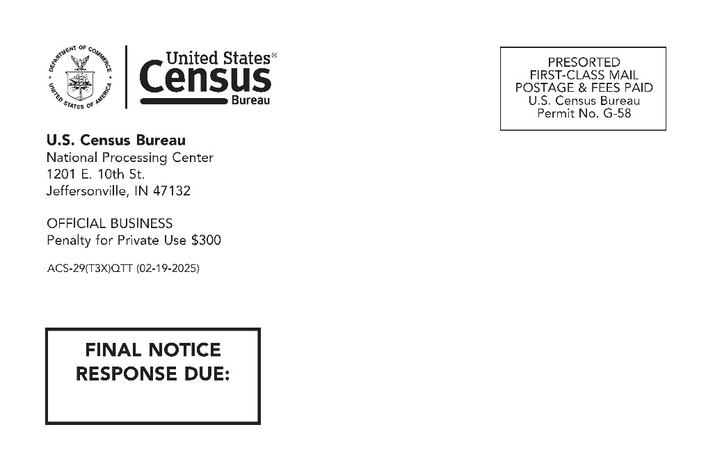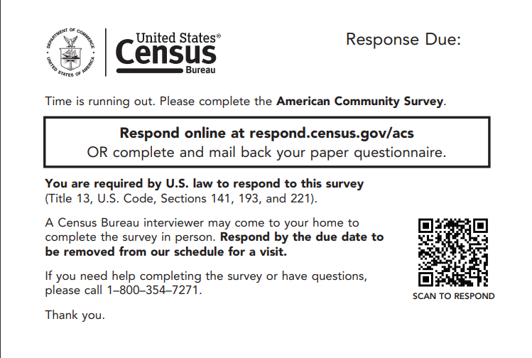 To encourage self-response, the Census Bureau sends as many as six mailings to a mailable sampled address. The list of mailable sampled addresses is updated three times during this process to remove households that have responded. The sooner an ACS response is received from a household, the fewer mailings we send to that address.