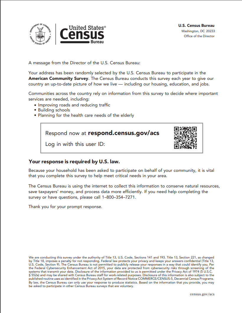 Currently, an ACS respondent must type the URL provided in the mailing materials to access the survey. However, with a QR code, respondents would not have to open a browser and type in the URL, and instead they could simply scan the code with their smart device. Providing a QR code might be helpful for respondents to access the survey quicker, reducing respondent burden.1
