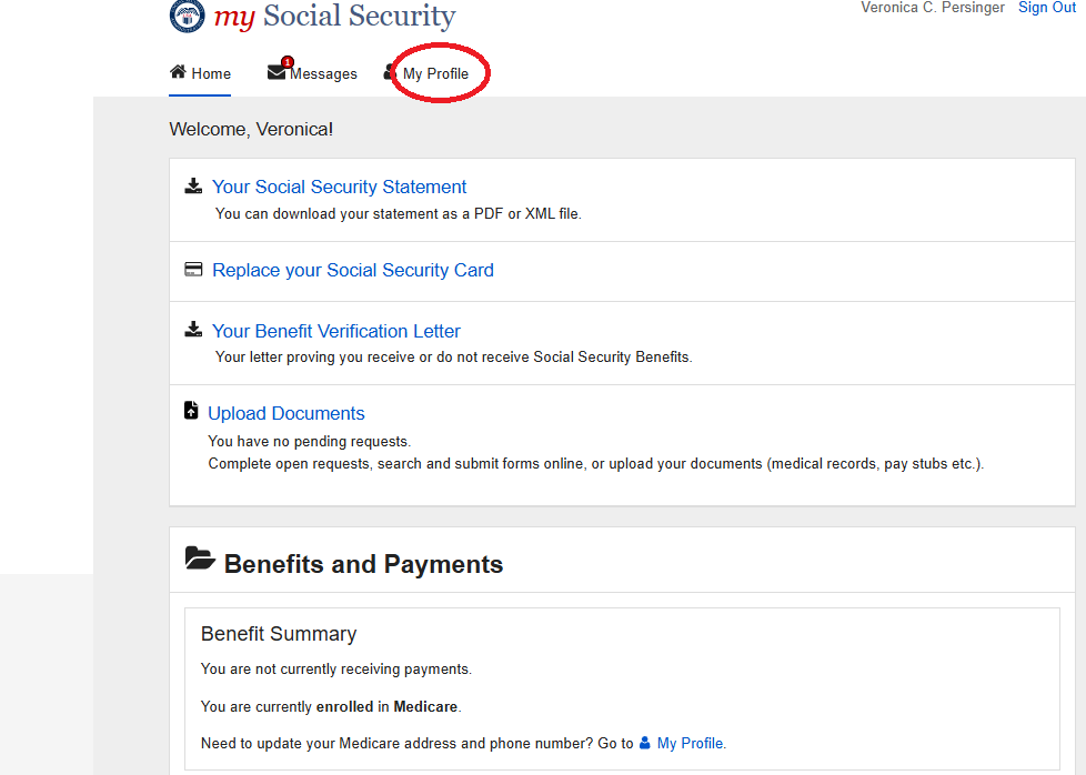 1. User selects ‘My Profile’ in the MySSA Home page