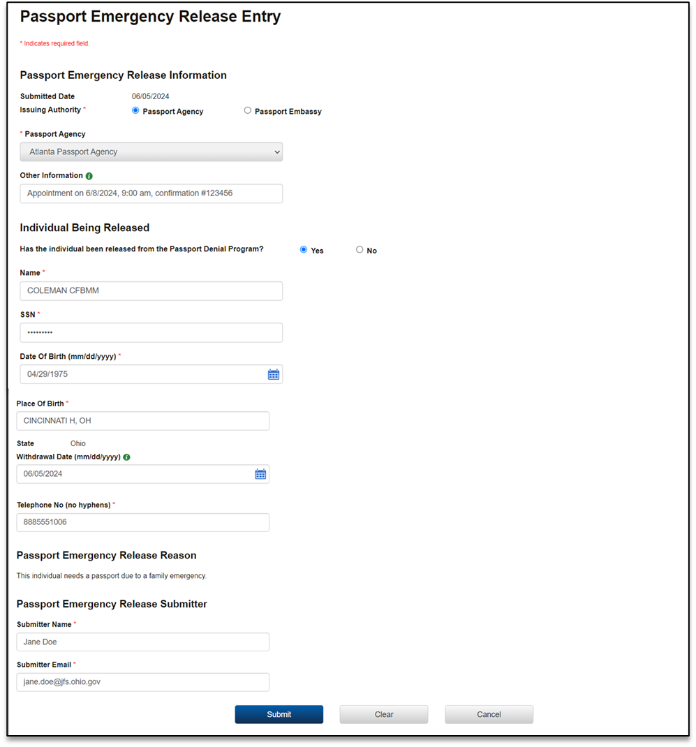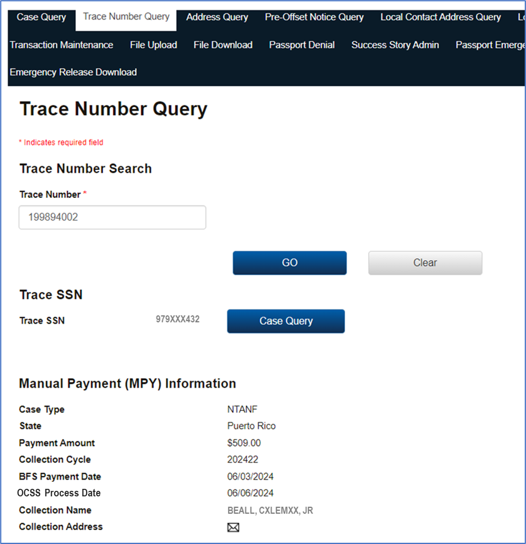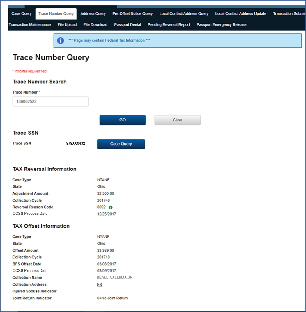 PAPERWORK REDUCTION ACT OF 1995 (Pub. L. 104-13) STATEMENT OF PUBLIC BURDEN: The purpose of this statutorily required (42 U.S.C. 652(b); 42 U.S.C. 664; 26 U.S.C. 6402(c); 31 CFR 285.3; 45 CFR 302.60; 45 CFR 303.72; 31 U.S.C. 3701 et seq.; 31 U.S.C. 3716(h); 31 CFR 285.1; 42 U.S.C. 652(k); 42 U.S.C. 654(31); 22 CFR 51.60; 42 U.S.C. 654(31); 42 U.S.C. 664; 31 CFR 285.1; and 31 CFR 285.3) information collection is to collect past due child support. Public reporting estimated burden for this collection of information is 0.01 hours per respondent, including the time for reviewing instructions, gathering and maintaining the data needed, and reviewing the collection of information. As provided by the 5 U.S.C. §§552a(b) and (e), any confidential information collected for this program is protected secured, and accessed only by authorized users. A federal agency may not conduct or sponsor an information collection without a valid OMB Control Number. No individual or entity is required to respond to, nor shall an individual or entity be subject to a penalty for failure to comply with a collection of information subject to the requirements of the Paperwork Reduction Act of 1995, without a current valid OMB Control Number. If you have any comments on this collection of information, please contact OCSSFedSystems@acf.hhs.gov.
