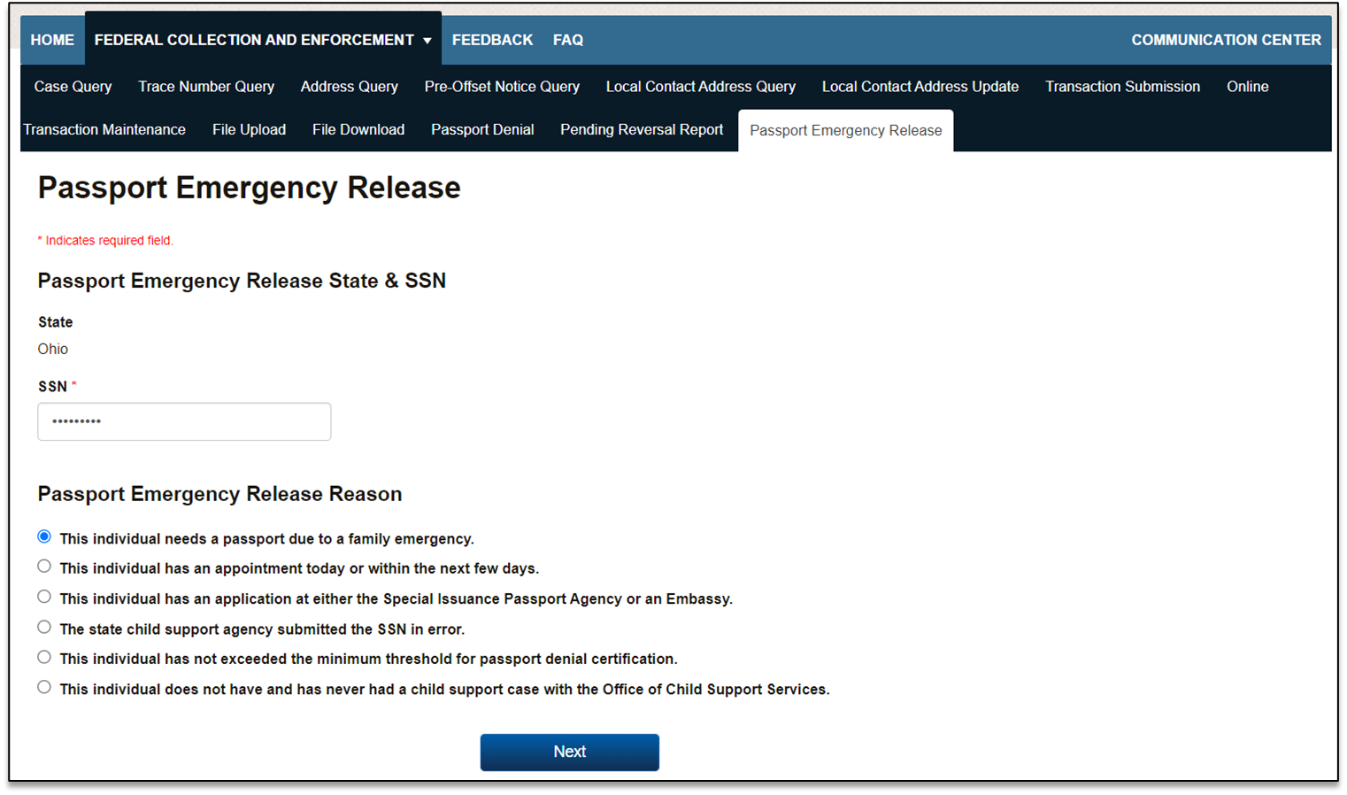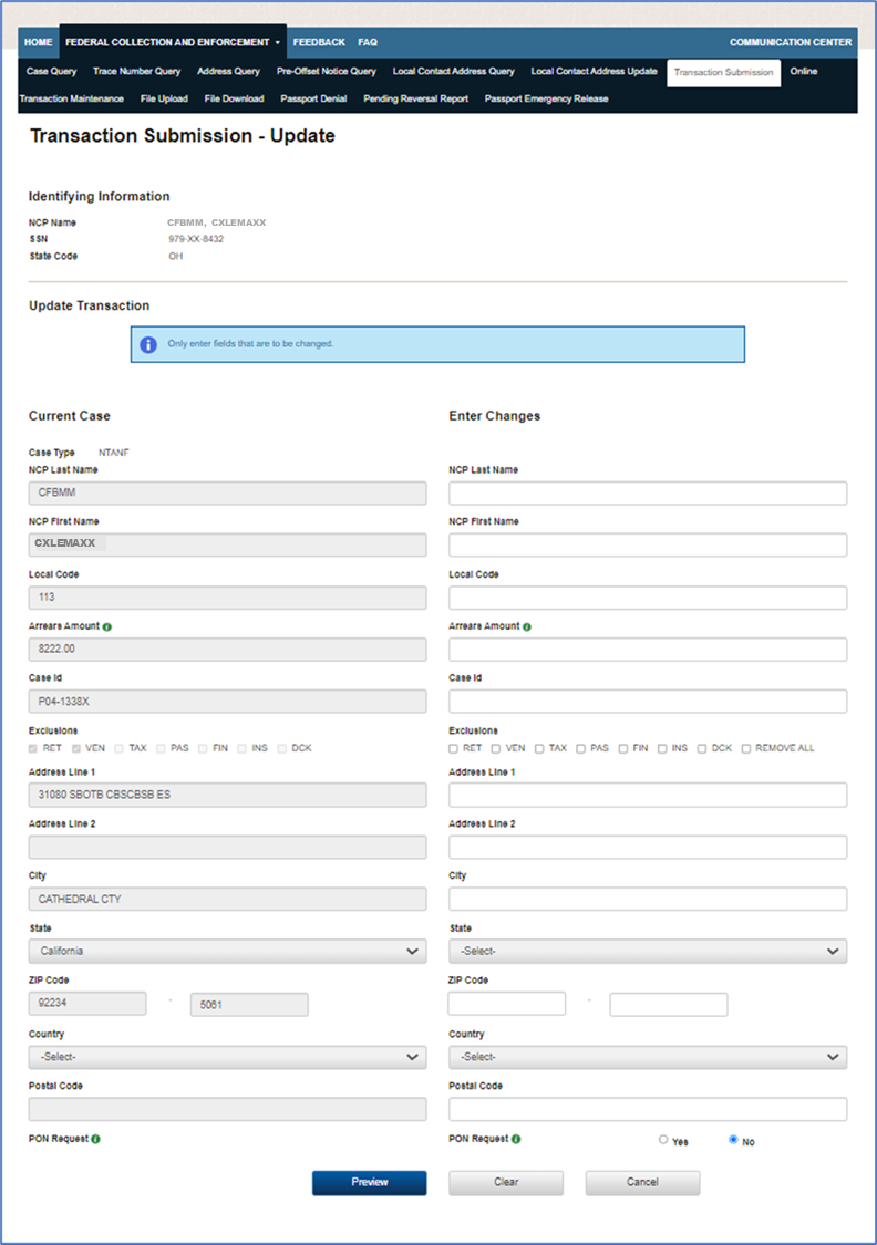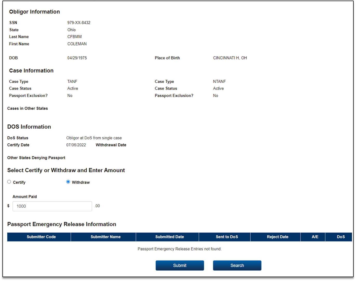 Child Support Portal – Tax Offset, Administrative Offset, and Passport Denial Portal Processing Screens
