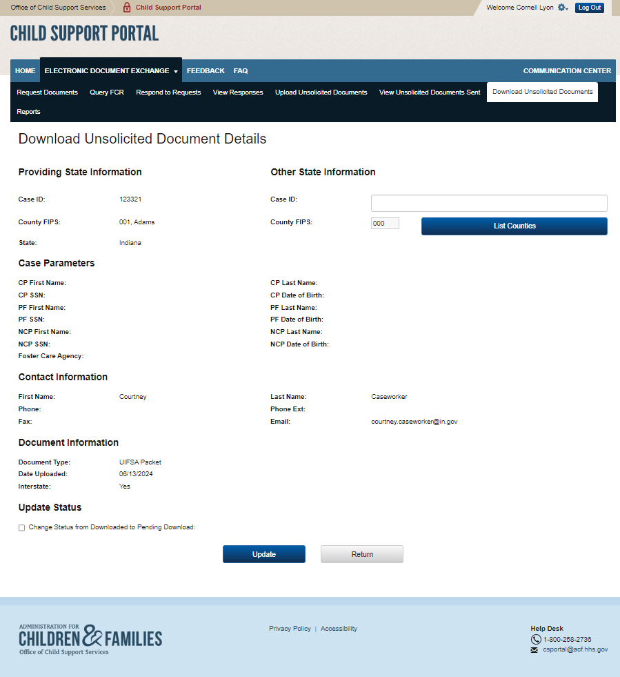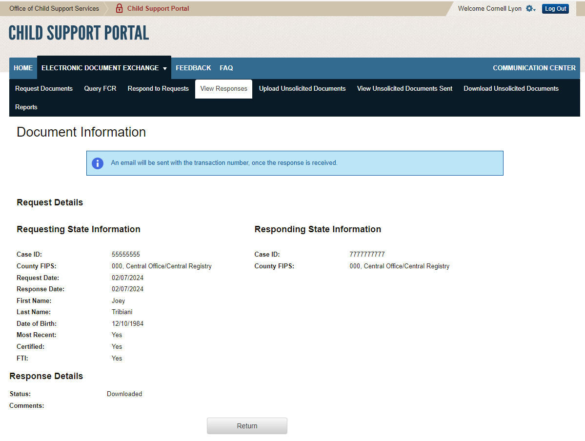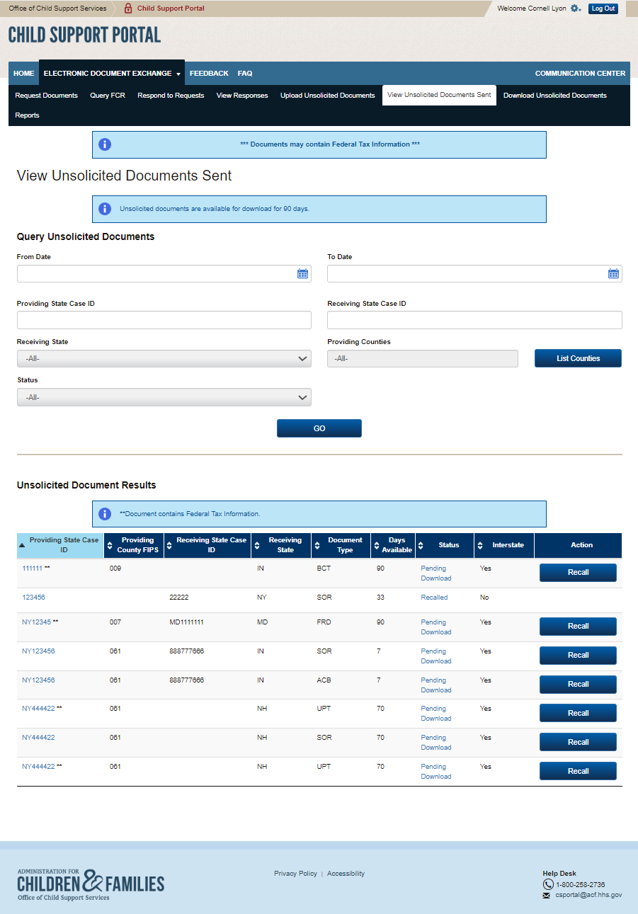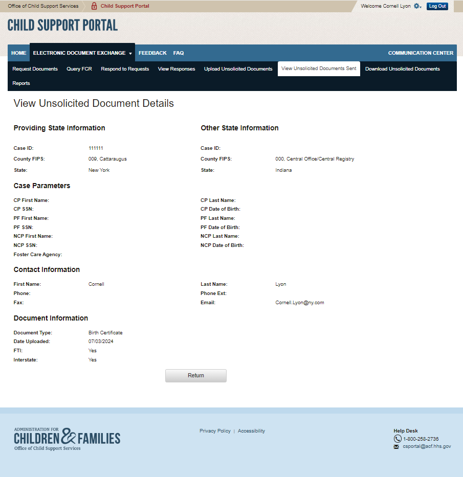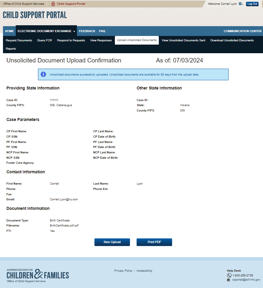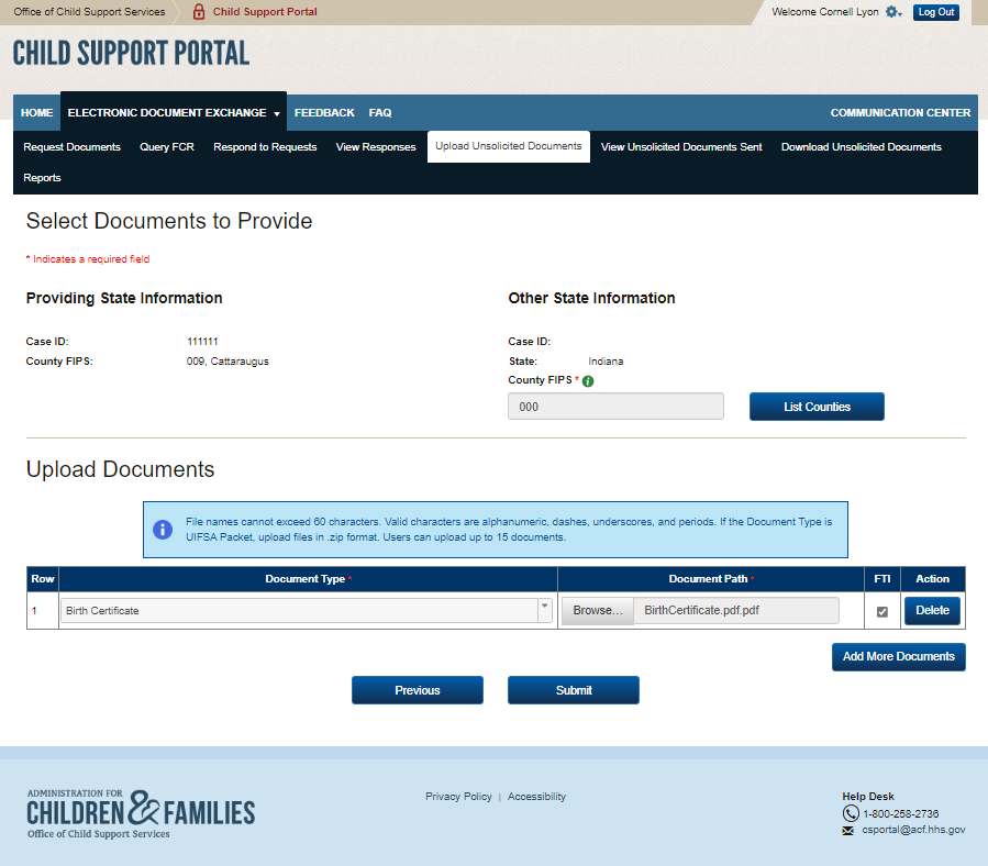 PAPERWORK REDUCTION ACT OF 1995 (Pub. L. 104-13) STATEMENT OF PUBLIC BURDEN: The purpose of this voluntary information collection is for authorized users in state child support agencies to exchange case documents electronically with other state child support agencies. Public reporting estimated burden for this collection of information is 0.17 hours per respondent, including the time for reviewing instructions, gathering and maintaining the data needed, and reviewing the collection of information. As provided by 42 U.S.C 653(m)(2), any confidential information collected for this program is secured and accessed only by authorized users. A federal agency may not conduct or sponsor an information collection without a valid OMB Control Number. No individual or entity is required to respond to, nor shall an individual or entity be subject to a penalty for failure to comply with a collection of information subject to the requirements of the Paperwork Reduction Act of 1995, without a current valid OMB Control Number. If you have any comments on this collection of information, please contact OCSSFedSystems@acf.hhs.gov