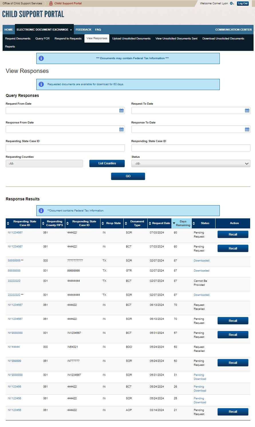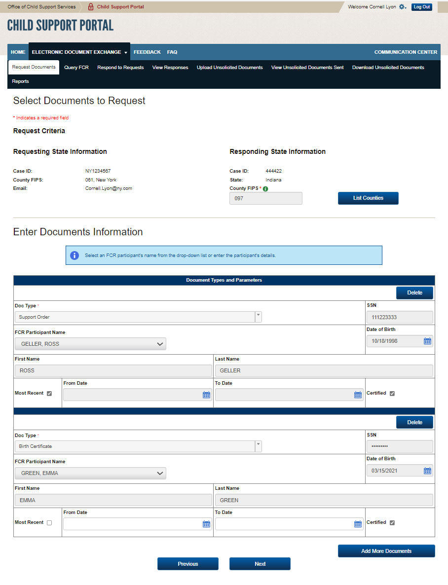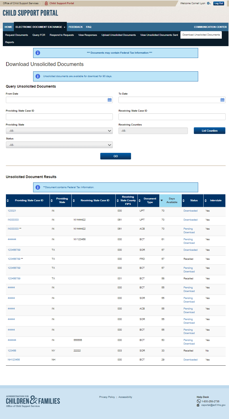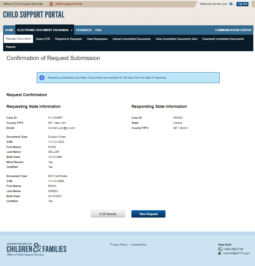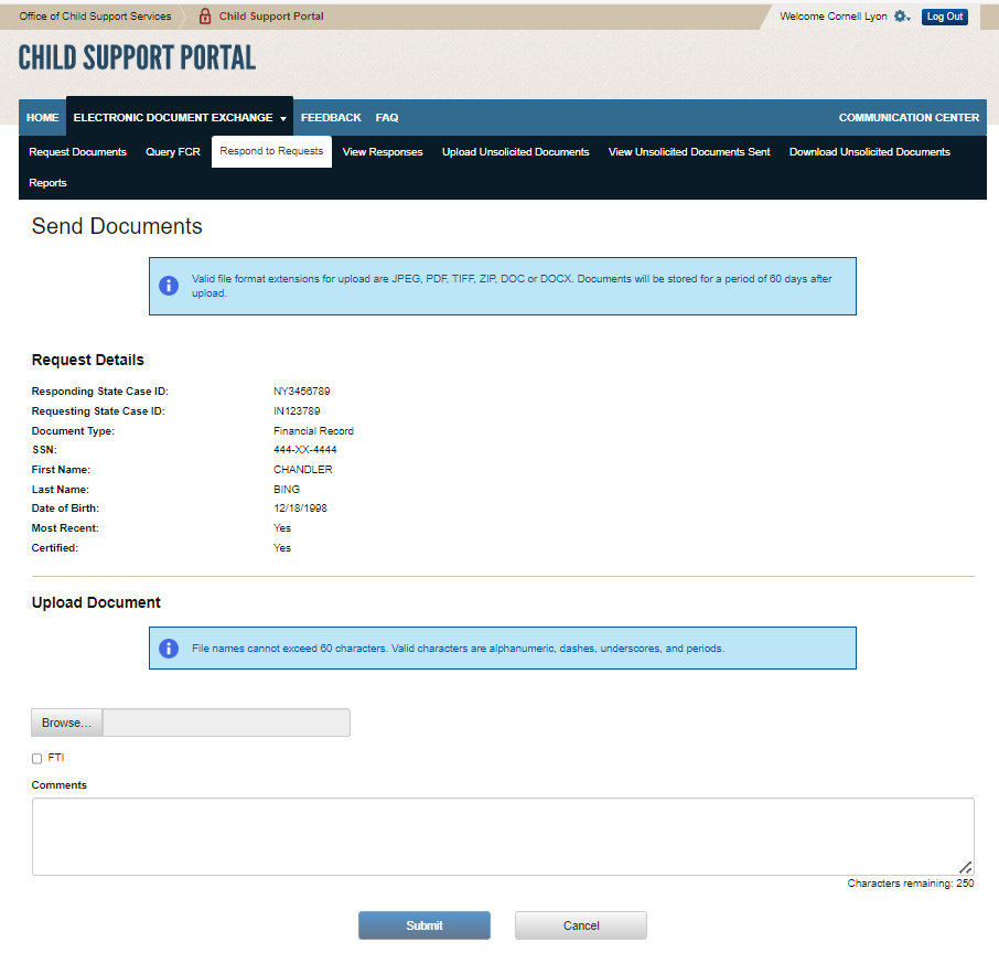 PAPERWORK REDUCTION ACT OF 1995 (Pub. L. 104-13) STATEMENT OF PUBLIC BURDEN: The purpose of this voluntary information collection is for authorized users in state child support agencies to exchange case documents electronically with other state child support agencies. Public reporting estimated burden for this collection of information is 0.17 hours per respondent, including the time for reviewing instructions, gathering and maintaining the data needed, and reviewing the collection of information. As provided by 42 U.S.C 653(m)(2), any confidential information collected for this program is secured and accessed only by authorized users. A federal agency may not conduct or sponsor an information collection without a valid OMB Control Number. No individual or entity is required to respond to, nor shall an individual or entity be subject to a penalty for failure to comply with a collection of information subject to the requirements of the Paperwork Reduction Act of 1995, without a current valid OMB Control Number. If you have any comments on this collection of information, please contact OCSSFedSystems@acf.hhs.gov