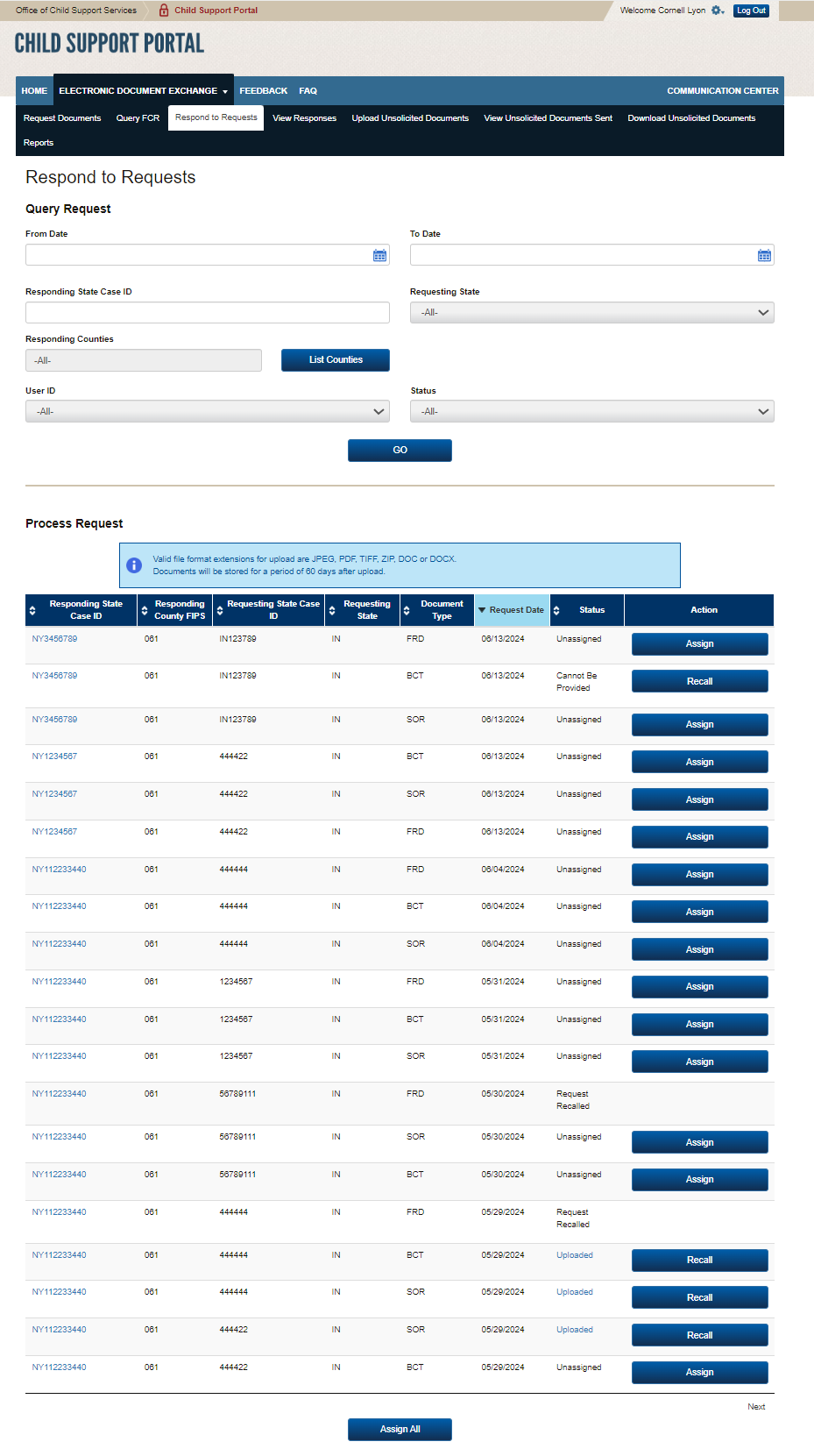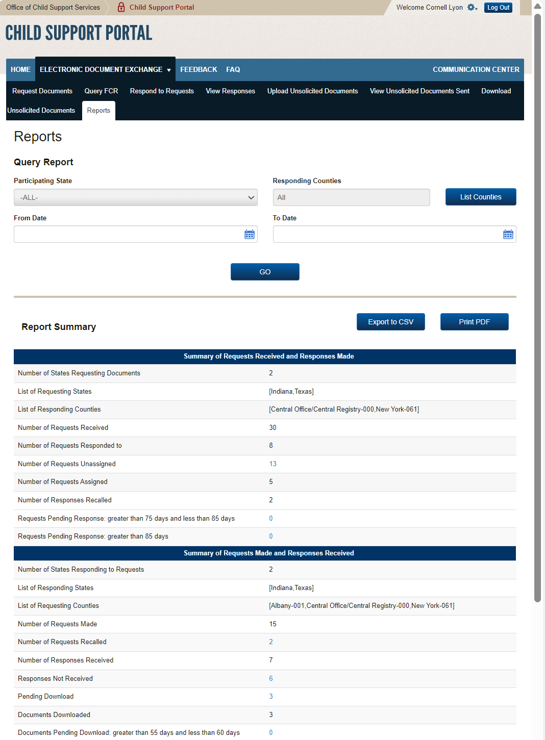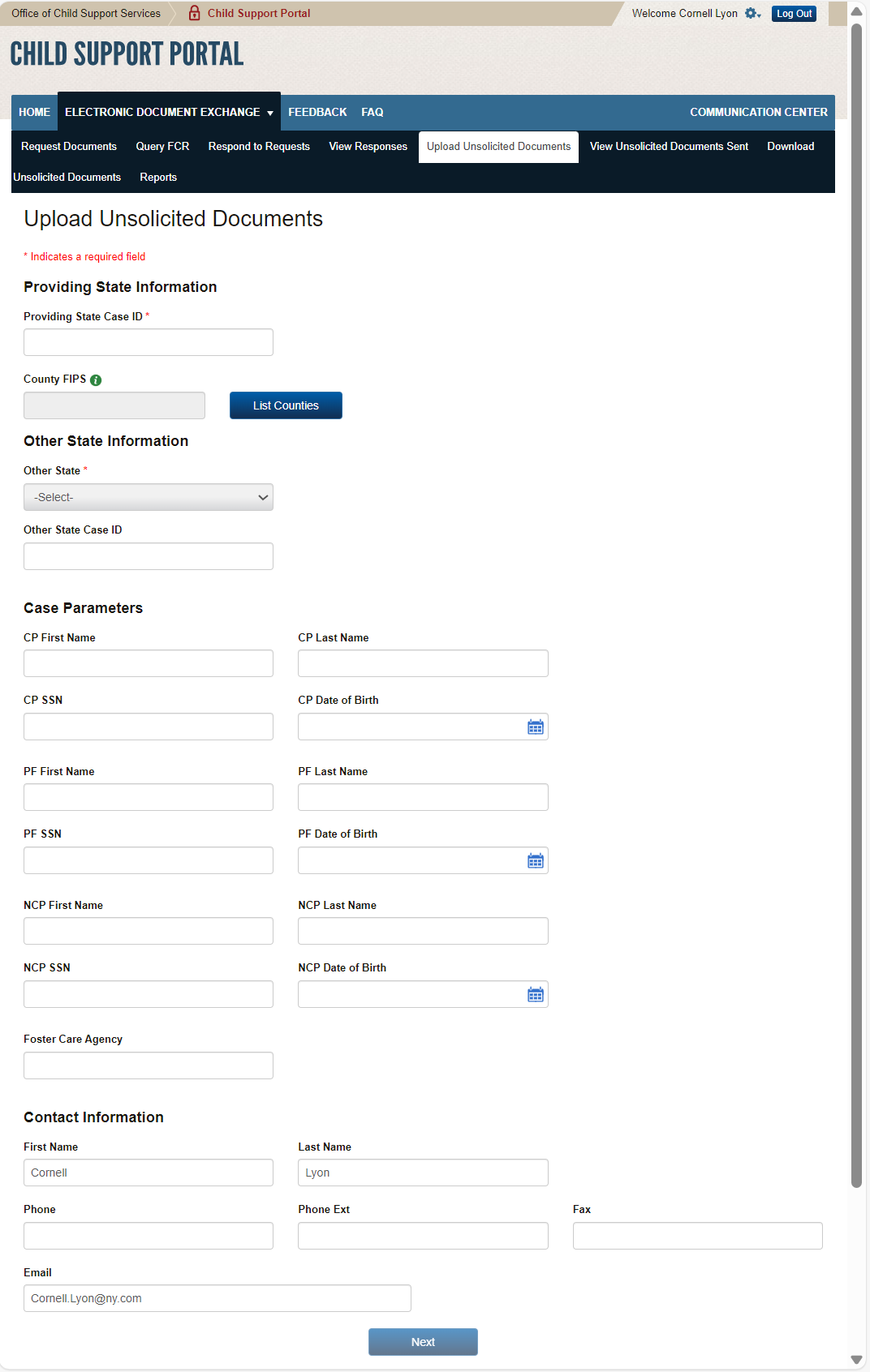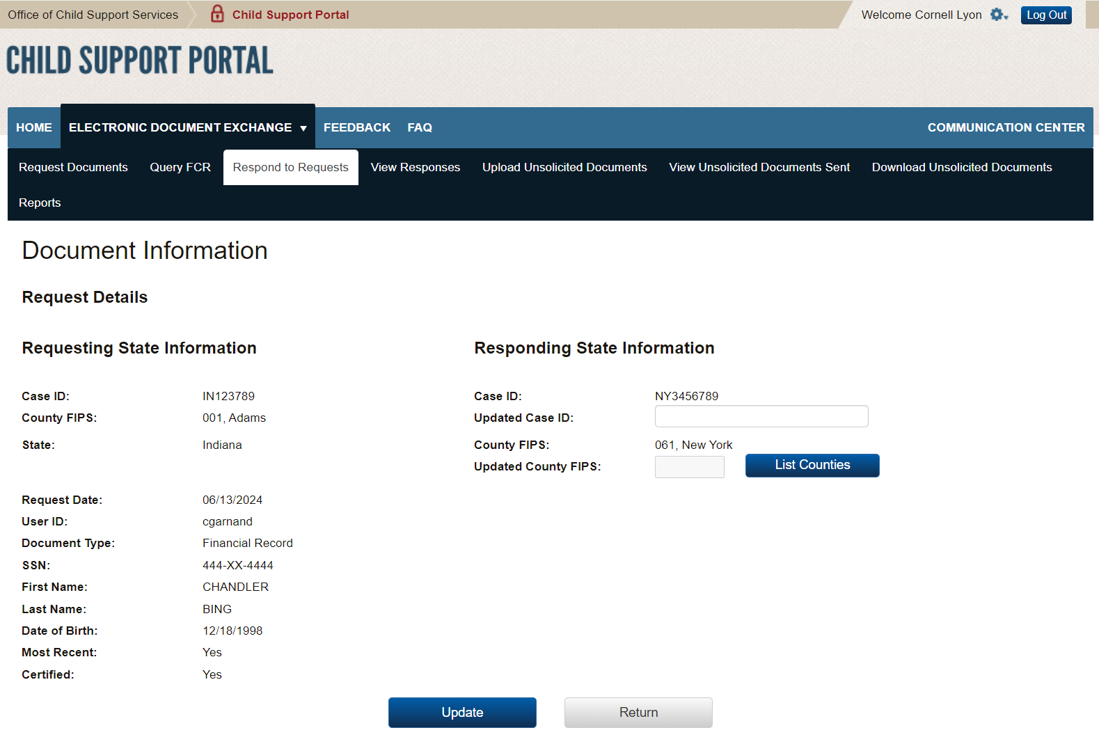 PAPERWORK REDUCTION ACT OF 1995 (Pub. L. 104-13) STATEMENT OF PUBLIC BURDEN: The purpose of this voluntary information collection is for authorized users in state child support agencies to exchange case documents electronically with other state child support agencies. Public reporting estimated burden for this collection of information is 0.17 hours per respondent, including the time for reviewing instructions, gathering and maintaining the data needed, and reviewing the collection of information. As provided by 42 U.S.C 653(m)(2), any confidential information collected for this program is secured and accessed only by authorized users. A federal agency may not conduct or sponsor an information collection without a valid OMB Control Number. No individual or entity is required to respond to, nor shall an individual or entity be subject to a penalty for failure to comply with a collection of information subject to the requirements of the Paperwork Reduction Act of 1995, without a current valid OMB Control Number. If you have any comments on this collection of information, please contact OCSSFedSystems@acf.hhs.gov
