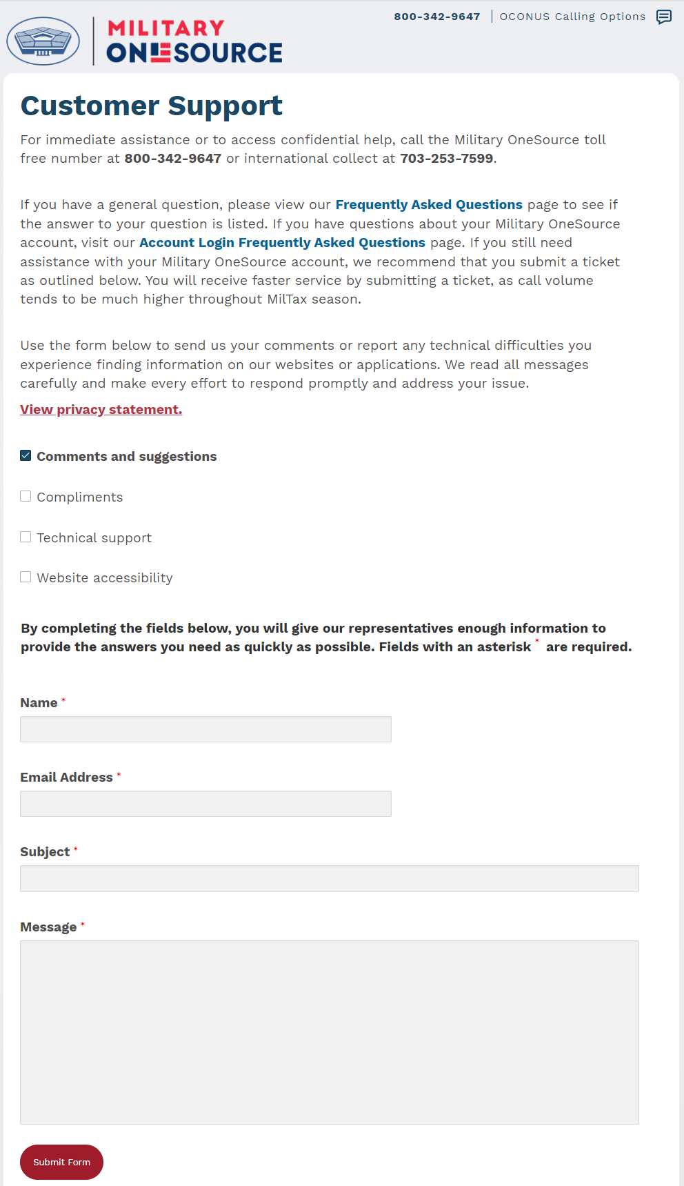 Customer support inquiry form received from users who have general questions/feedback about the Military OneSource program or website (https://public.militaryonesource.mil/feedback).