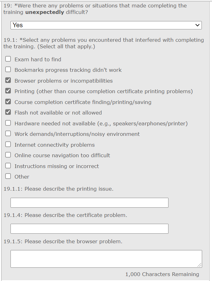 The screen capture images that follow show ALL of the questions included in the survey. Questions numbered with decimals (e.g., 17.1, 17.3, 17.3.1, 17.4, 19.1, 19.1.2, 19.1.4, 19.1.5, 19.1.6) are only displayed when a preceding response option is selected, triggering branching display logic for the sub-question. For example, selecting the response option “Other, please specify.” triggers display of a follow-up question and open-ended response text box.