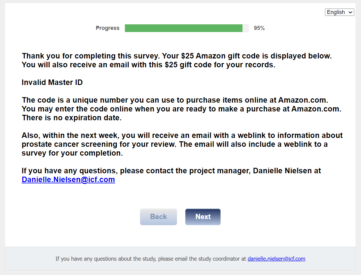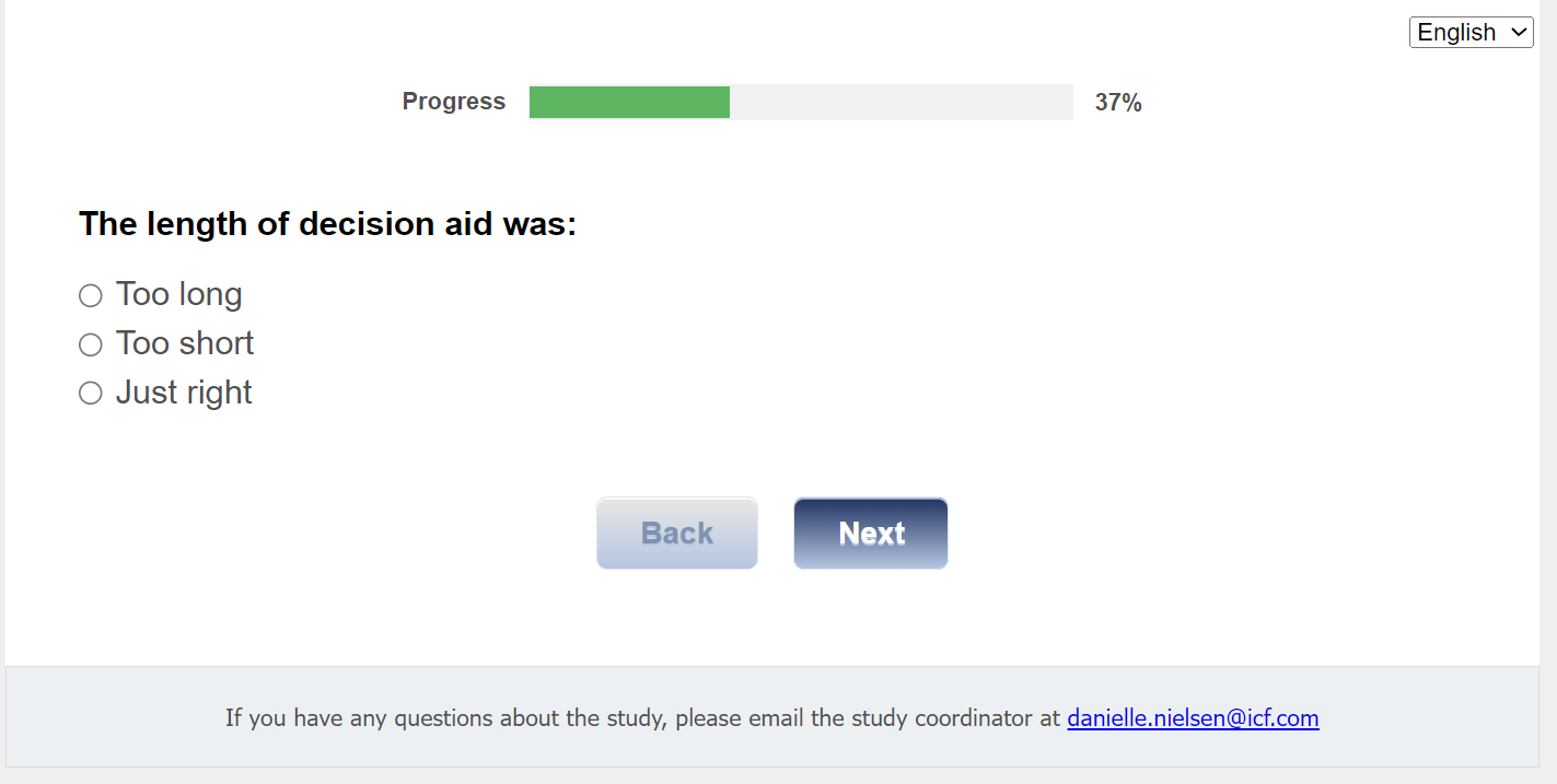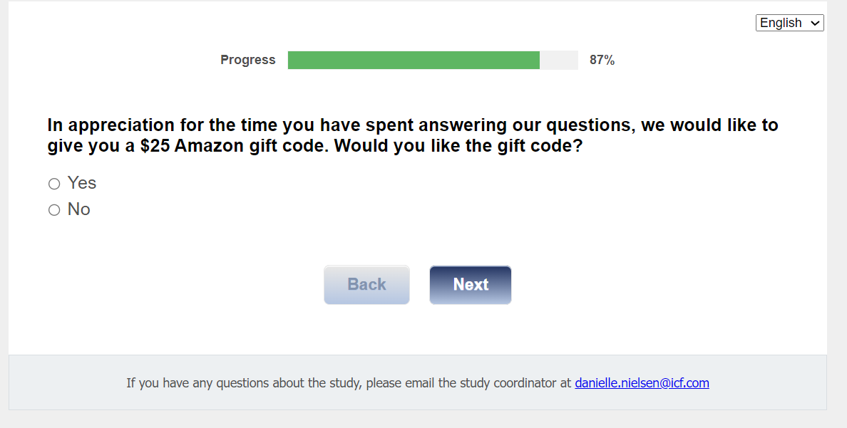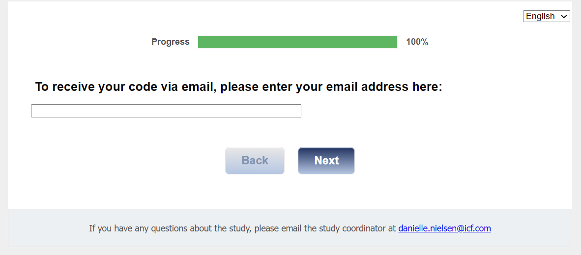 Survey Completion text: Thank you for completing the survey. If you have any additional questions, you can email the study coordinator at danielle.nielsen@icf.com >