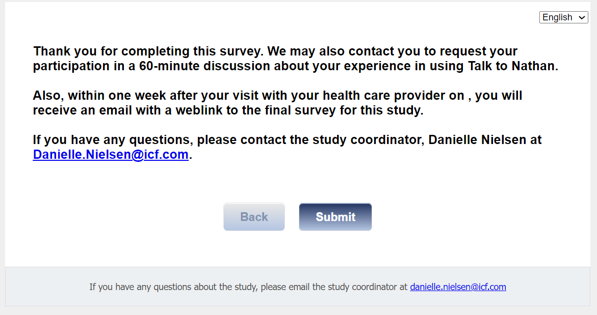 Thank you for completing this survey. We may also contact you to request your participation in a 60-minute discussion about your experience in using Talk to Nathan.