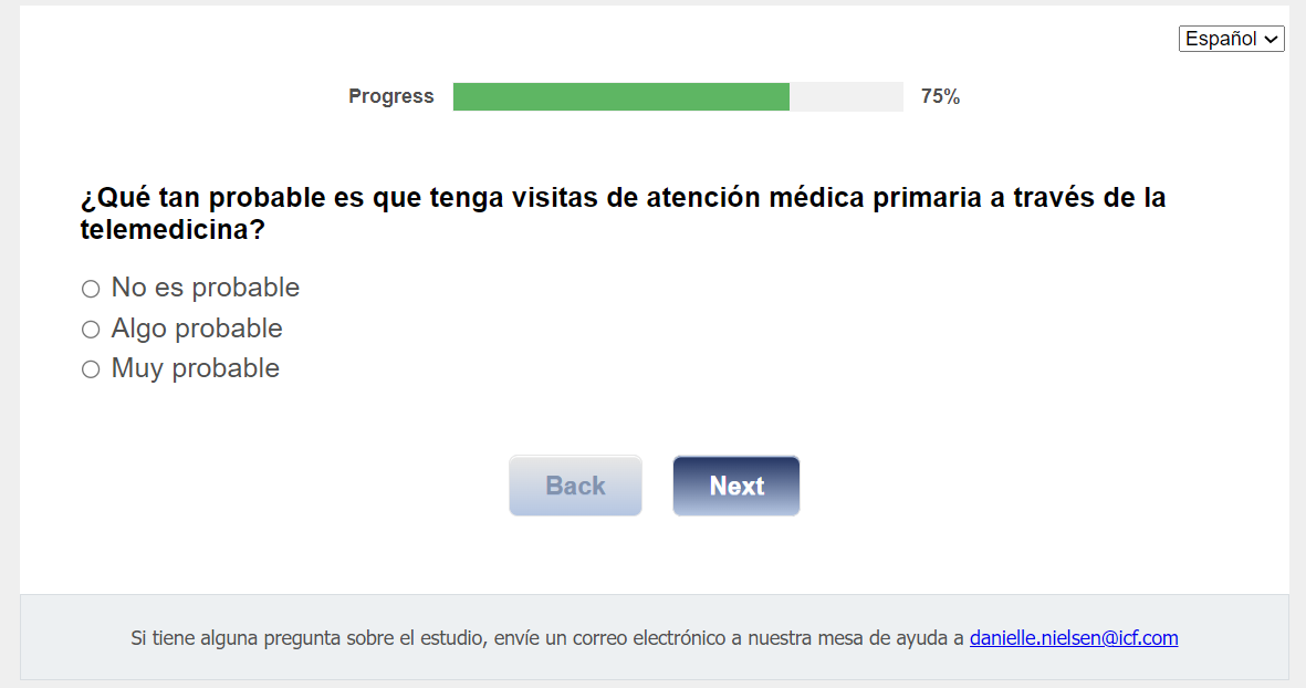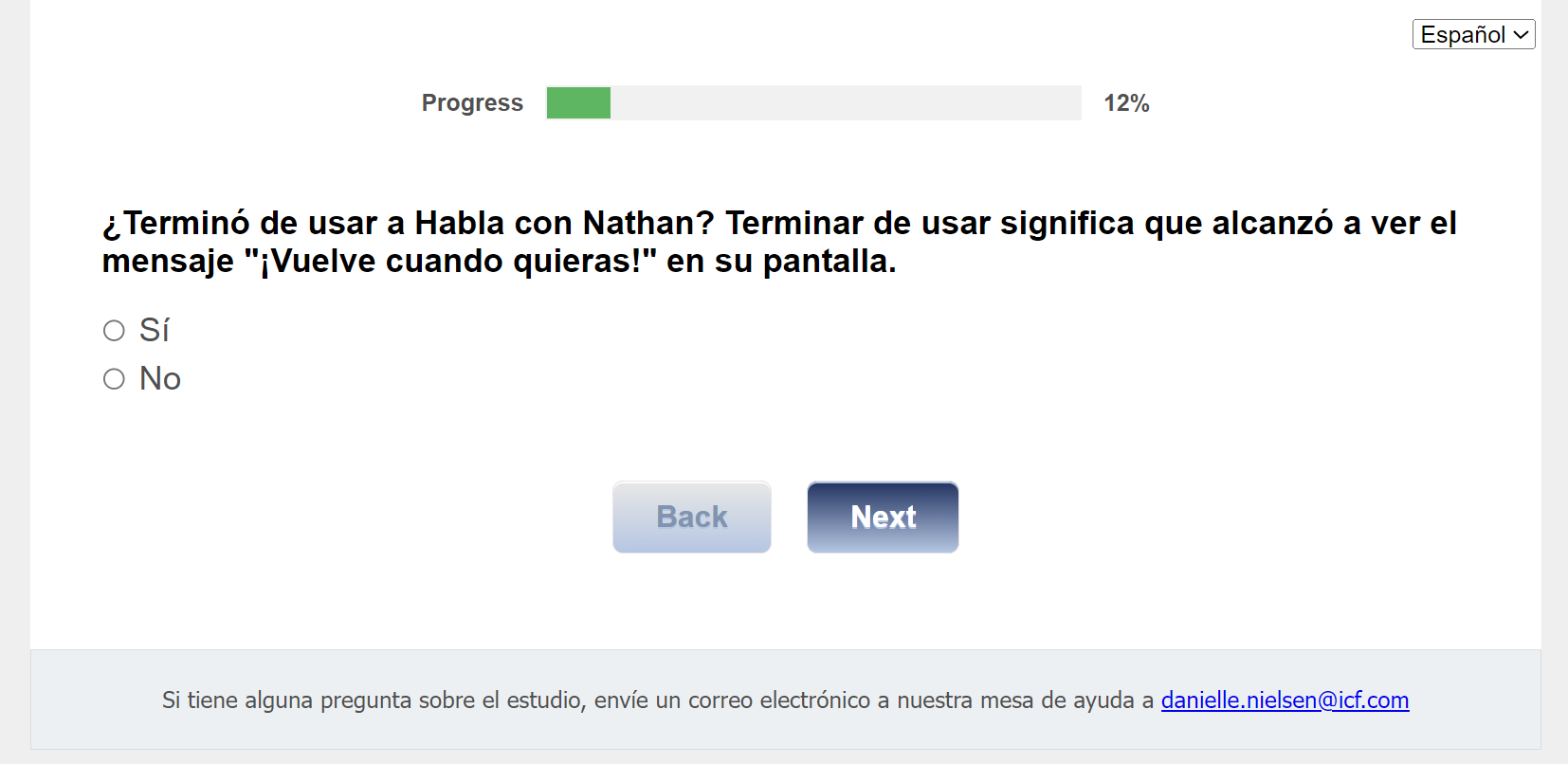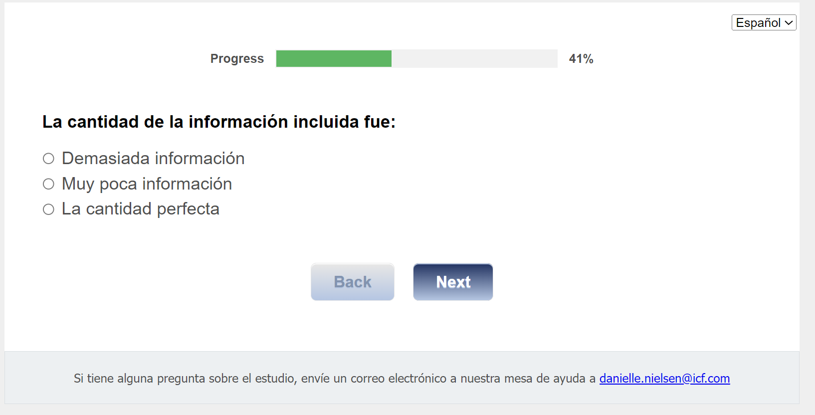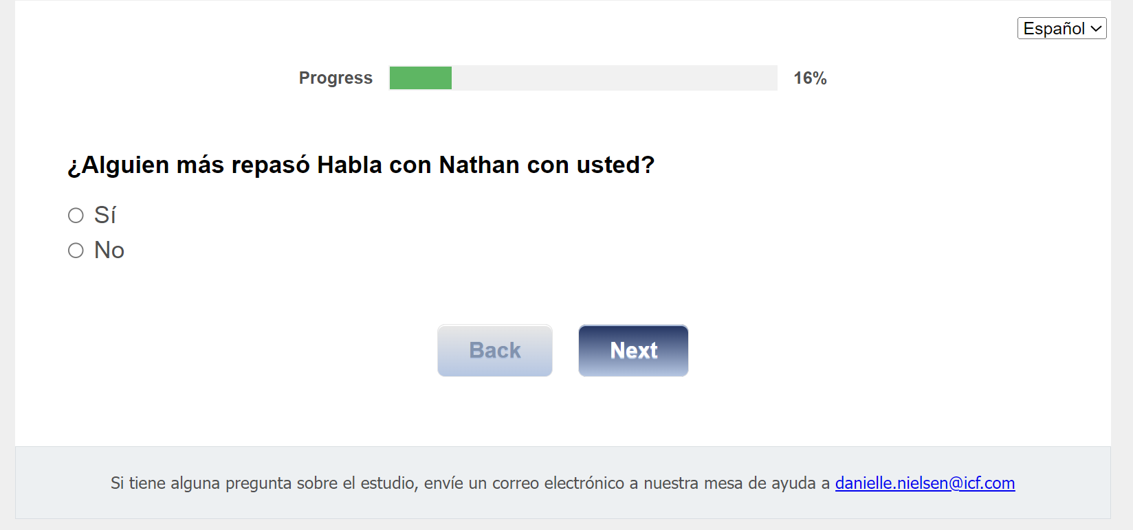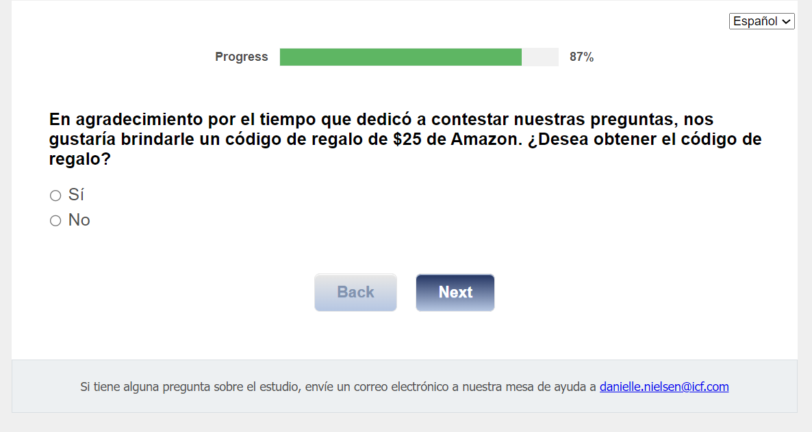 Footer Text: Si tiene alguna pregunta sobre el estudio, envíe un correo electrónico a nuestra mesa de ayuda a <danielle.nielsen@icf.com> |