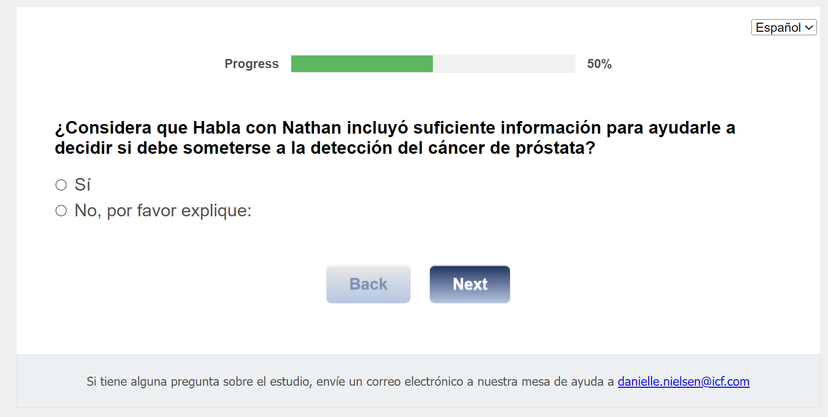 Gracias por participar en este estudio. El propósito de esta encuesta es comprender mejor si el programa Hable con Nathan sobre las pruebas de detección del cáncer de próstata de los CDC ayuda a los hombres a tomar decisiones sobre los daños y beneficios de las pruebas de detección del cáncer de próstata. Específicamente, queremos saber si esta ayuda interactiva para la toma de decisiones es utilizable, accesible y aceptable. Si completa esta encuesta, recibirá una tarjeta de regalo de $25.