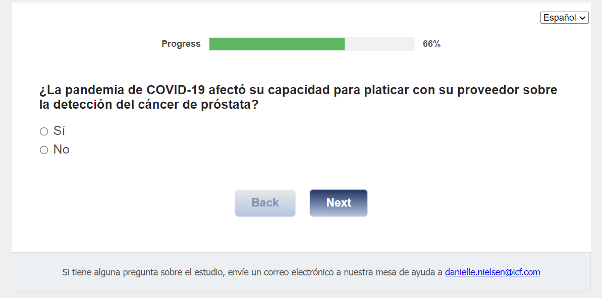 ¿Quién envía esta encuesta? ICF es una empresa consultora que trabaja con la División de Prevención y Control del Cáncer (Division of Cancer Prevention and Control; DCPC) de los Centros para el Control y la Prevención de Enfermedades (Centers for Disease Control and Prevention; CDC) para evaluar distintas ayudas para tomar decisiones sobre la detección del cáncer de próstata y su capacidad para ayudar a los hombres de 55 a 69 años a tomar la decisión de hacerse o no la prueba del PSA.