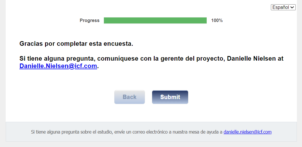 Survey Complete text: Gracias por completar la encuesta. Si tiene alguna pregunta sobre el estudio, envíe un correo electrónico al servicio de asistencia técnica de encuestas a <danielle.nielsen@icf.com>. |