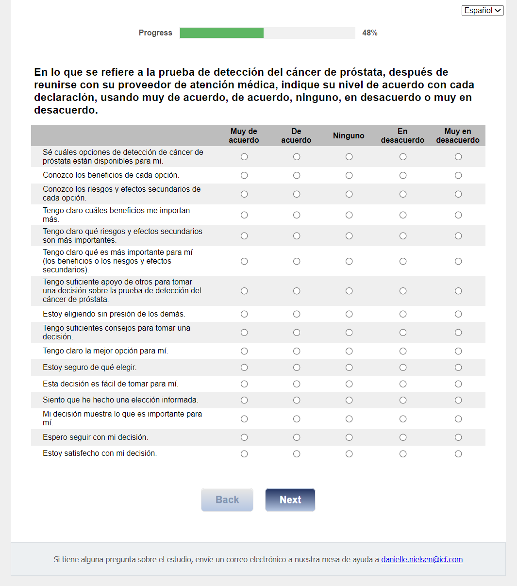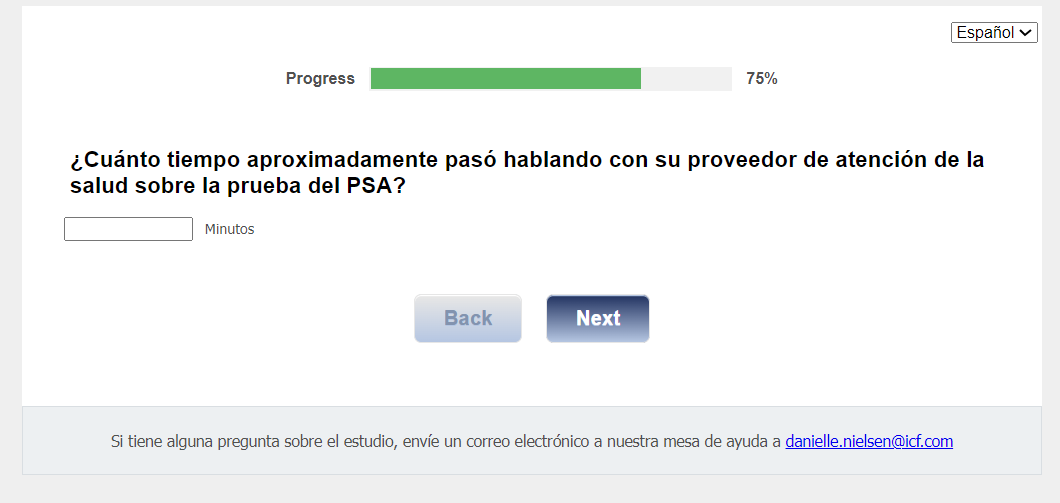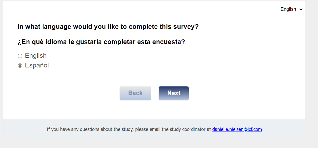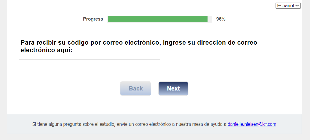 Footer Text: Si tiene alguna pregunta sobre el estudio, envíe un correo electrónico a nuestra mesa de ayuda a <danielle.nielsen@icf.com> |