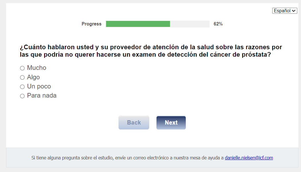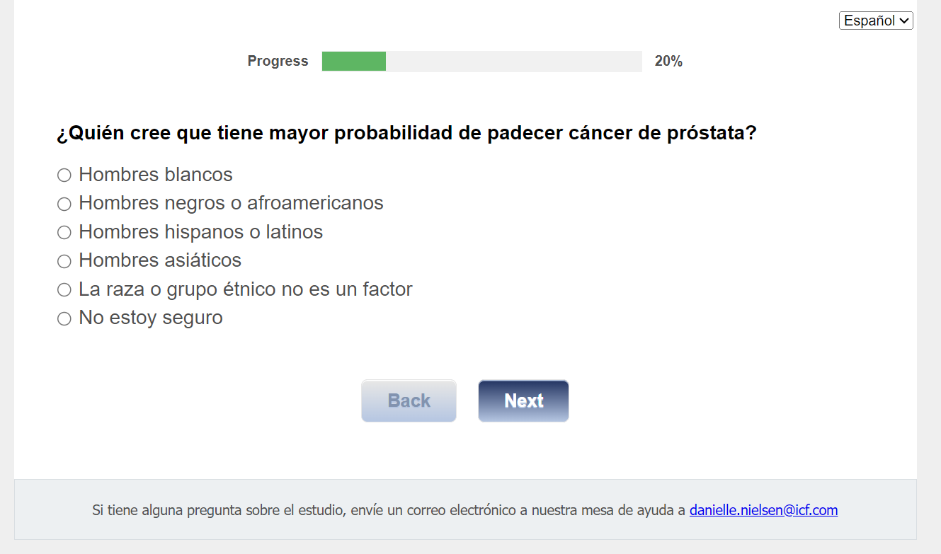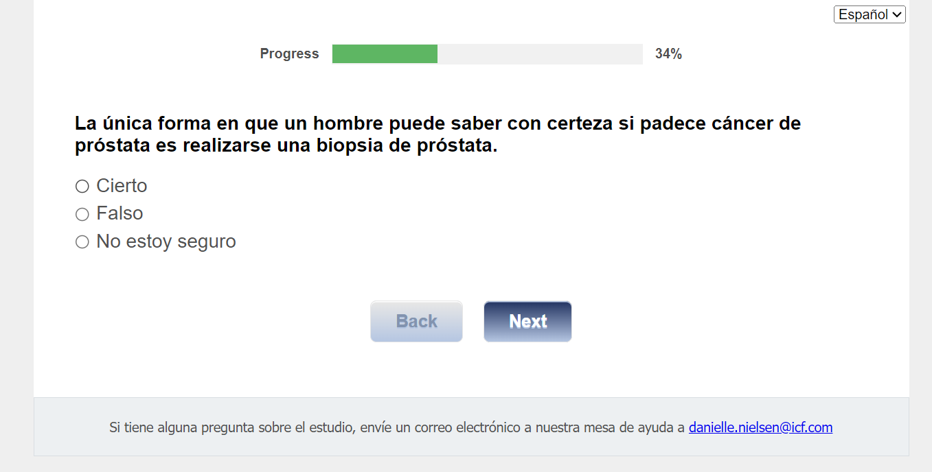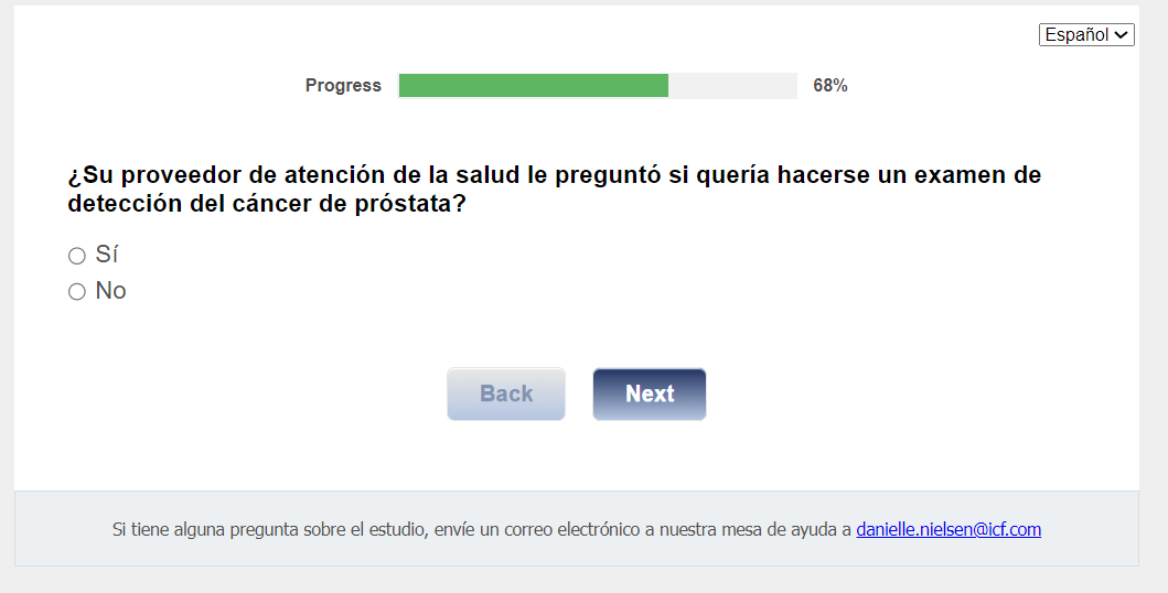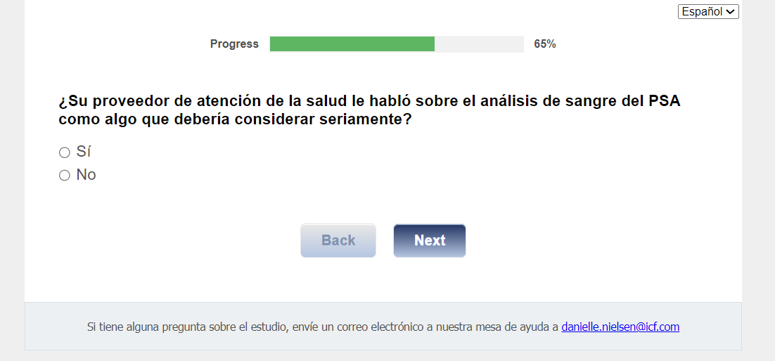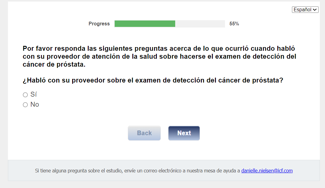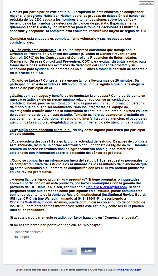 ¿Quién envía esta encuesta? ICF es una empresa consultora que trabaja con la División de Prevención y Control del Cáncer (Division of Cancer Prevention and Control; DCPC) de los Centros para el Control y la Prevención de Enfermedades (Centers for Disease Control and Prevention; CDC) para evaluar distintas ayudas para tomar decisiones sobre los exámenes de detección del cáncer de próstata y su capacidad para ayudar a los hombres de 55 a 69 años a tomar la decisión de hacerse o no la prueba del PSA.