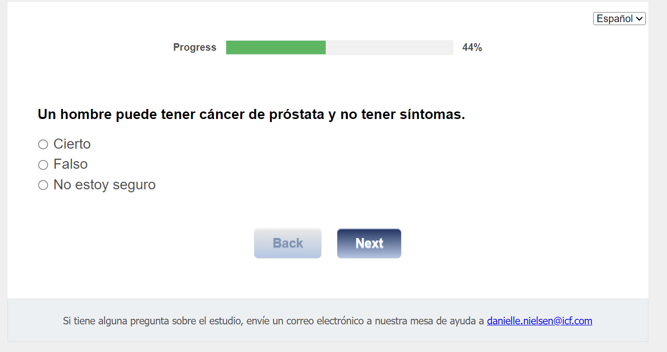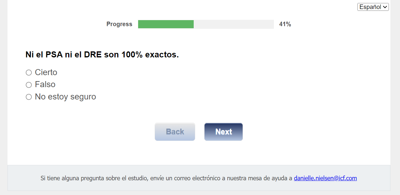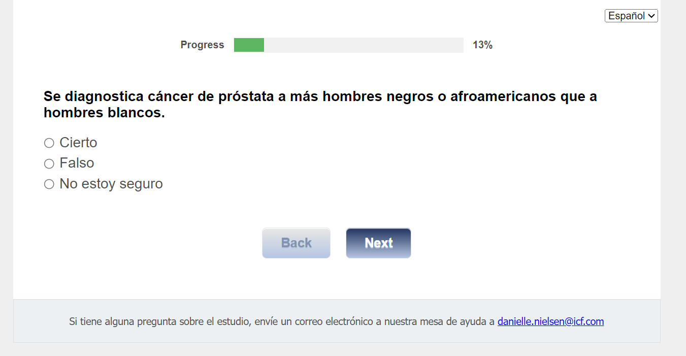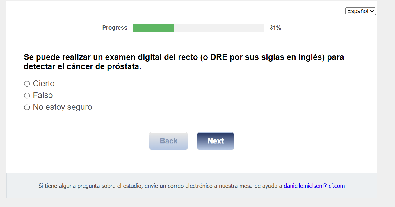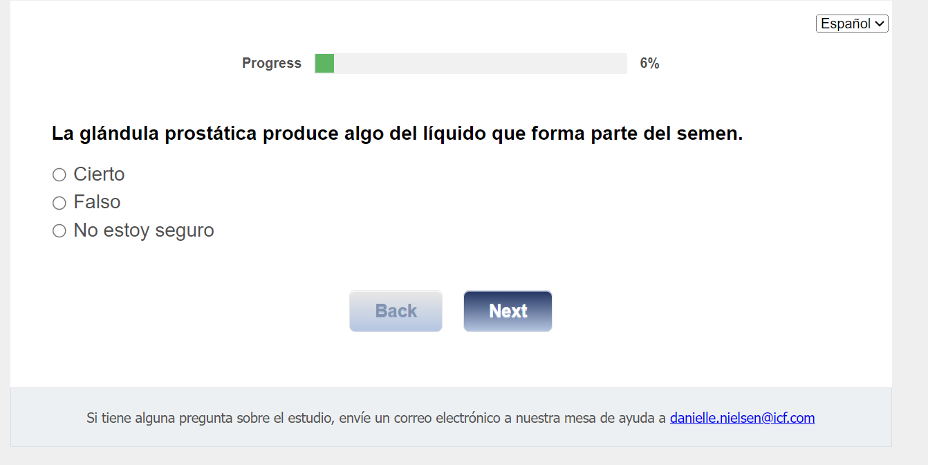 ¿Quién envía esta encuesta? ICF es una empresa consultora que trabaja con la División de Prevención y Control del Cáncer (Division of Cancer Prevention and Control; DCPC) de los Centros para el Control y la Prevención de Enfermedades (Centers for Disease Control and Prevention; CDC) para evaluar distintas ayudas para tomar decisiones sobre los exámenes de detección del cáncer de próstata y su capacidad para ayudar a los hombres de 55 a 69 años a tomar la decisión de hacerse o no la prueba del PSA.