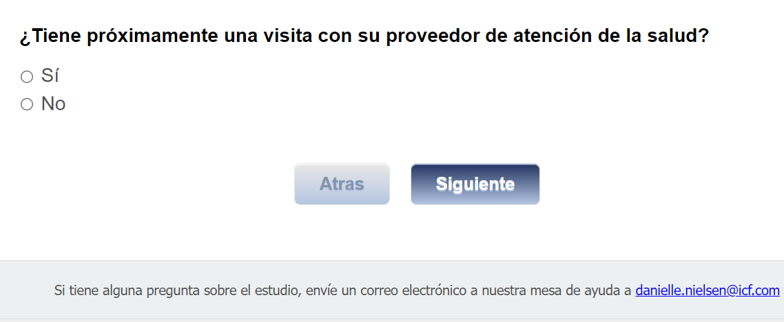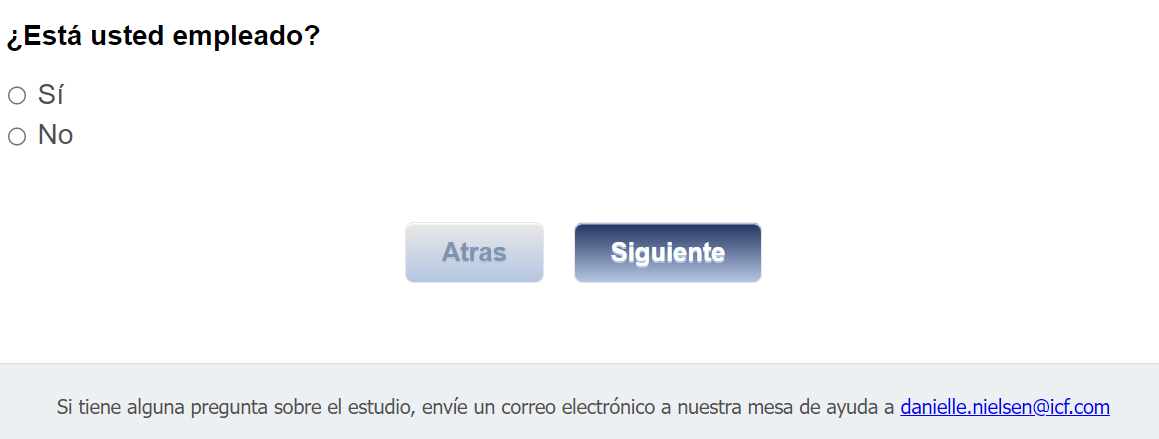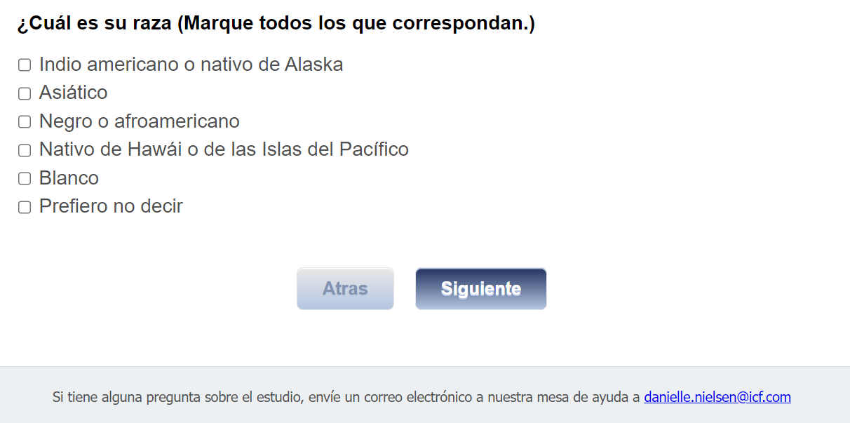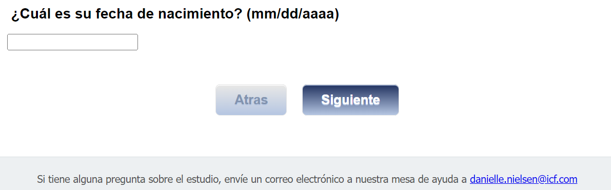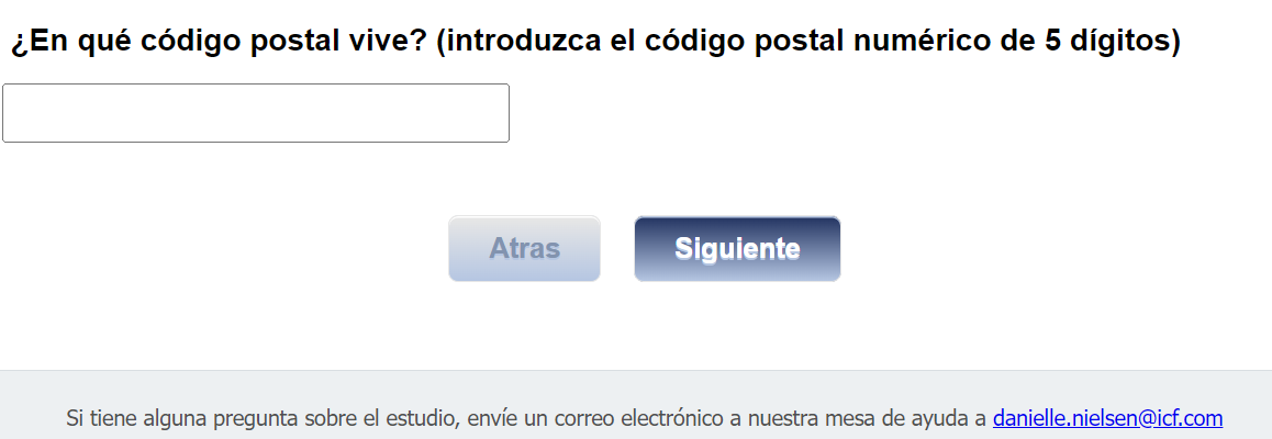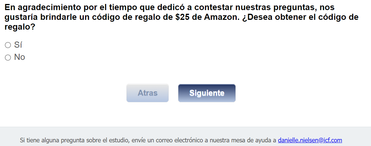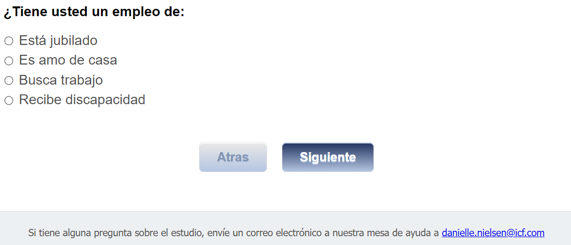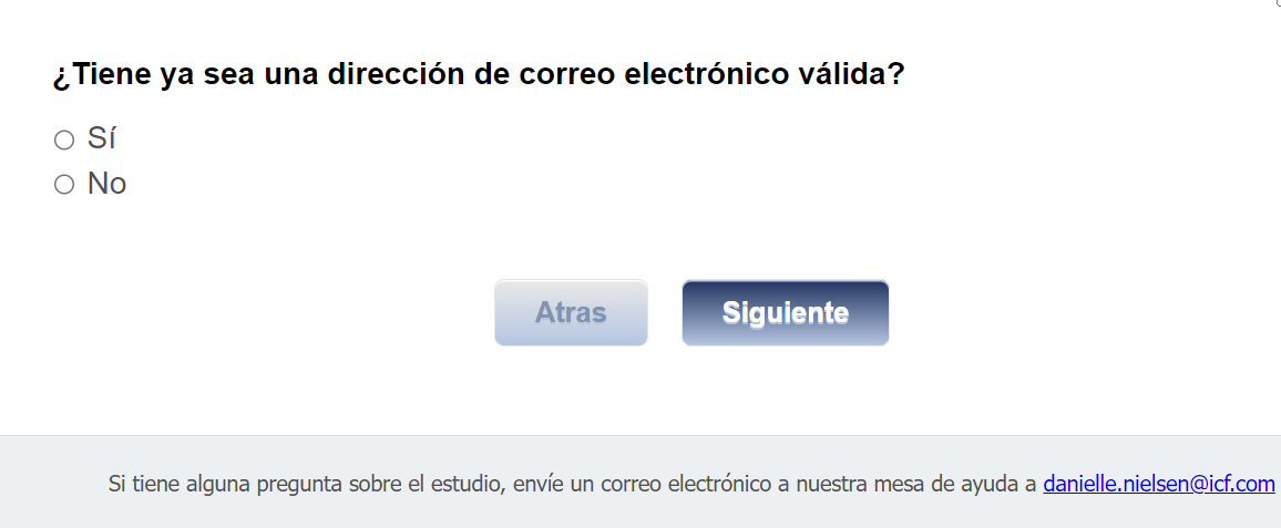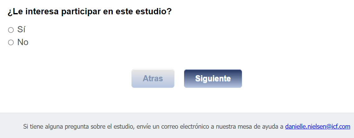 Footer Text: Si tiene alguna pregunta sobre el estudio, envíe un correo electrónico a nuestra mesa de ayuda a <danielle.nielsen@icf.com> |
