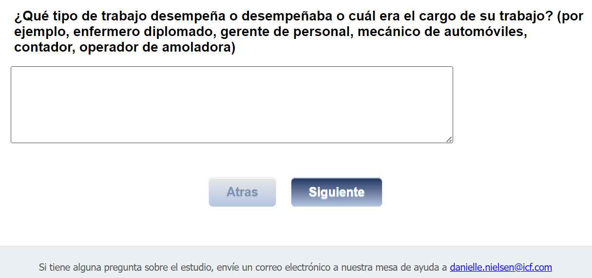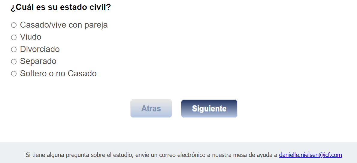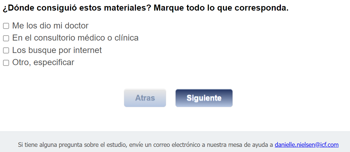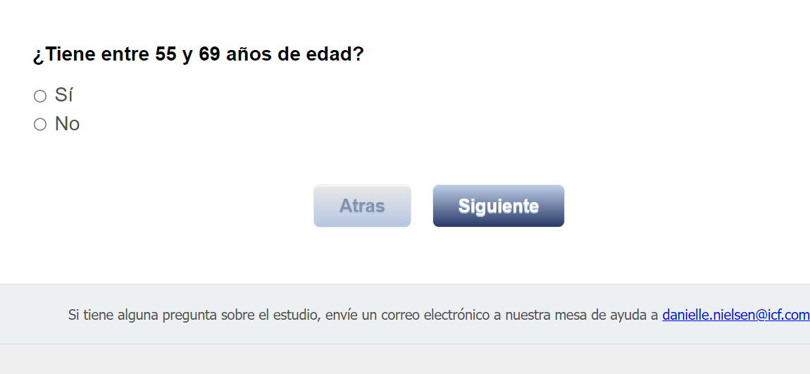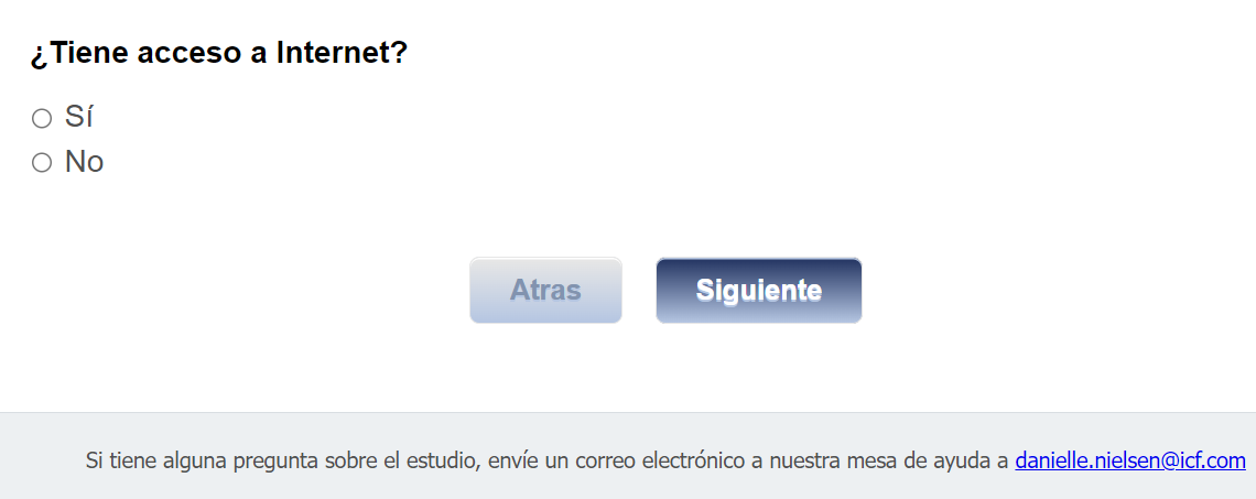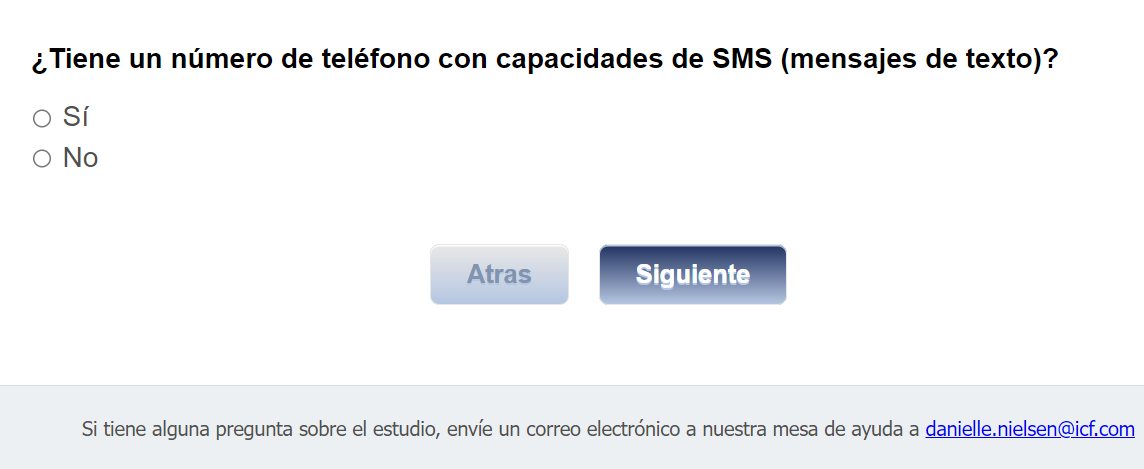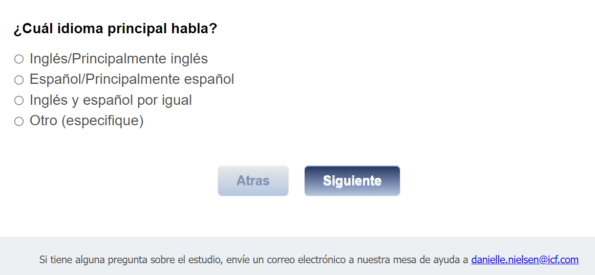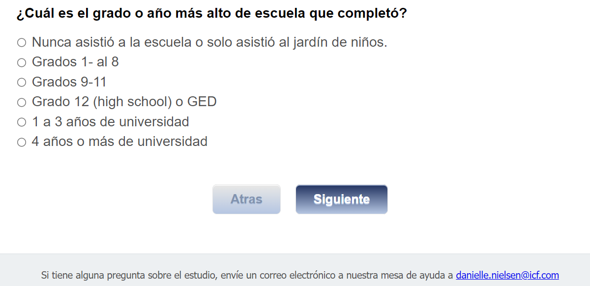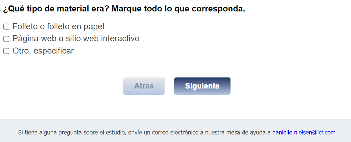 Footer Text: Si tiene alguna pregunta sobre el estudio, envíe un correo electrónico a nuestra mesa de ayuda a <danielle.nielsen@icf.com> |