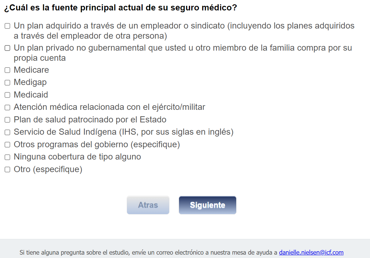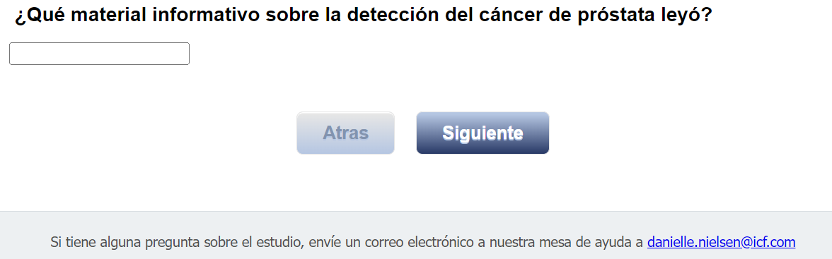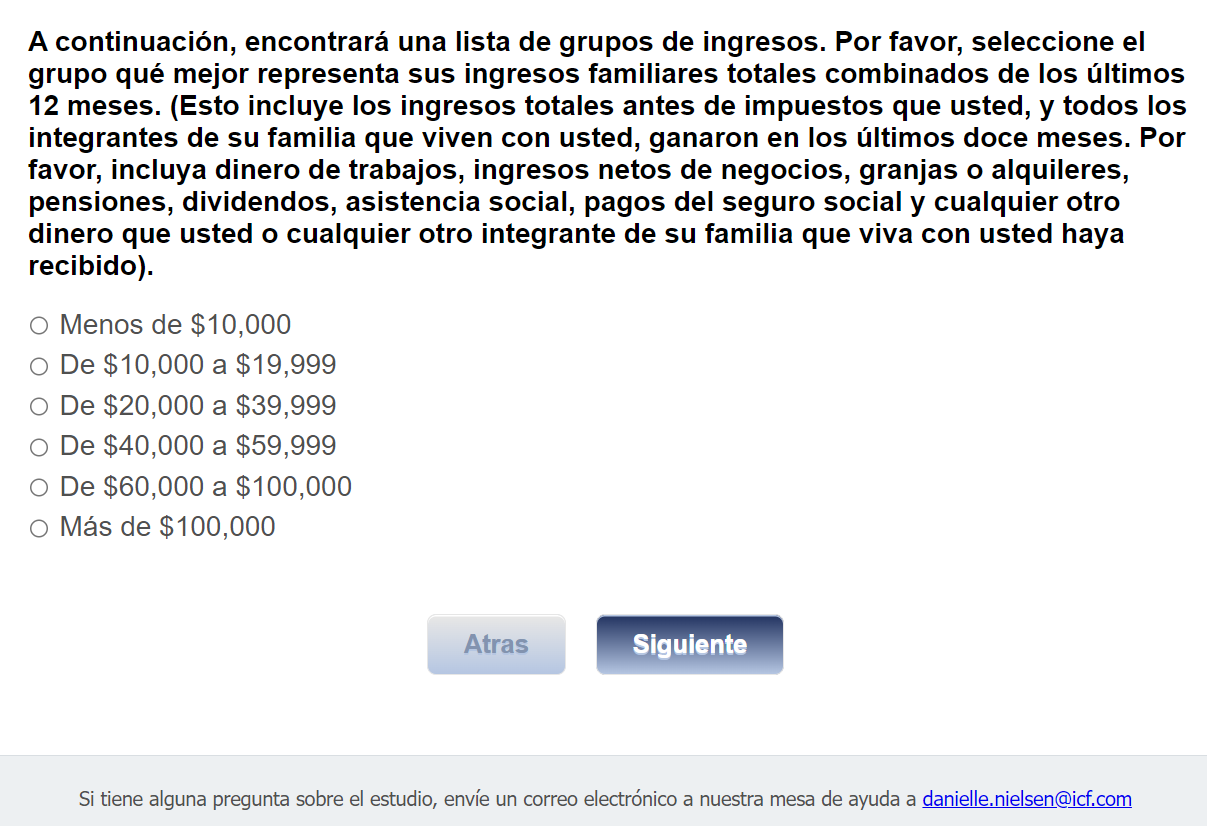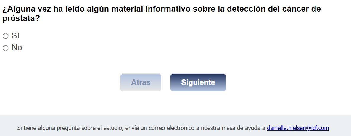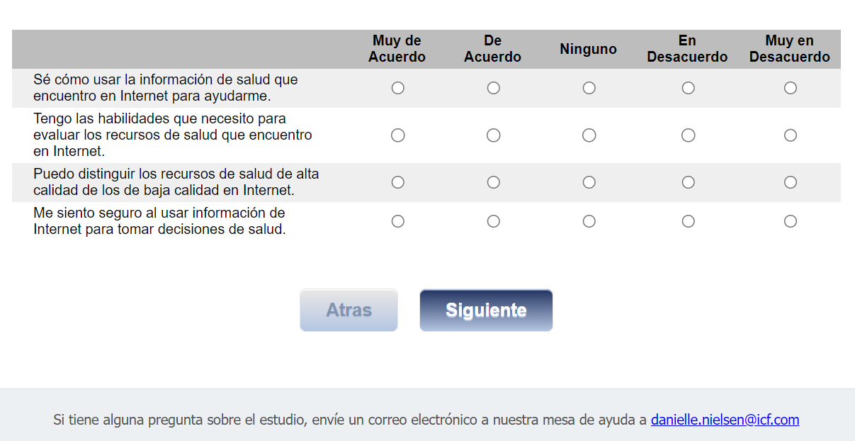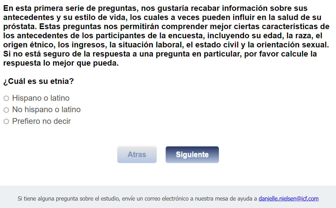 Footer Text: Si tiene alguna pregunta sobre el estudio, envíe un correo electrónico a nuestra mesa de ayuda a <danielle.nielsen@icf.com> |