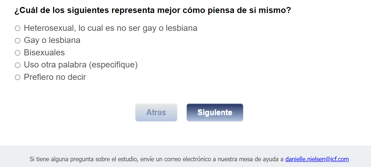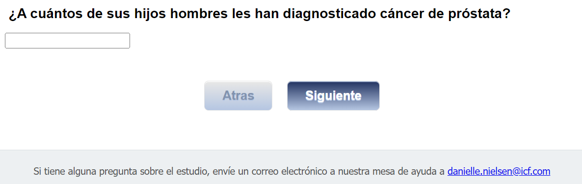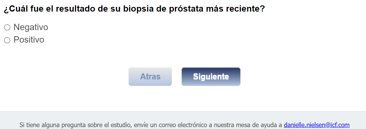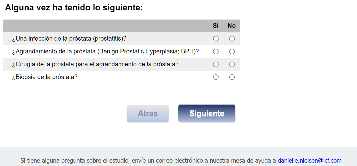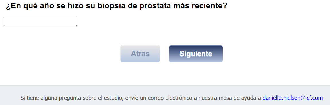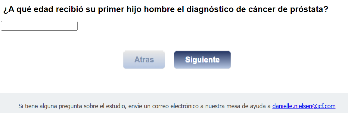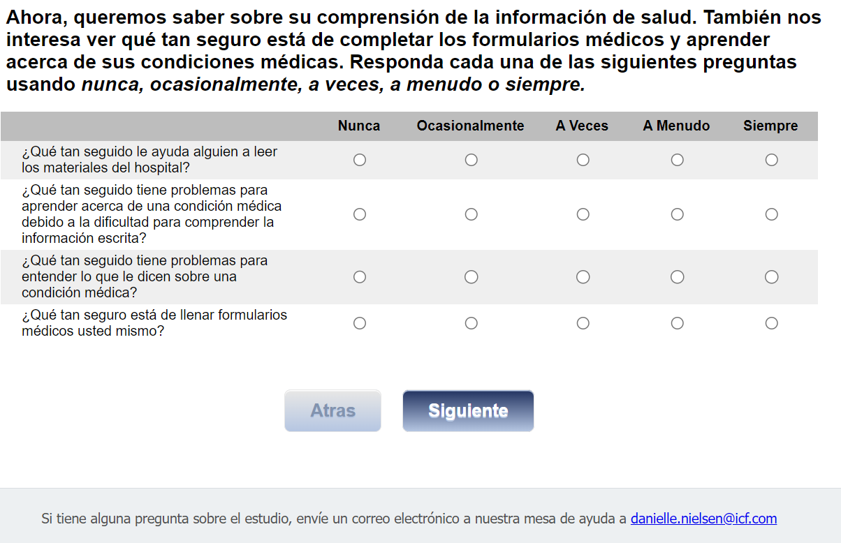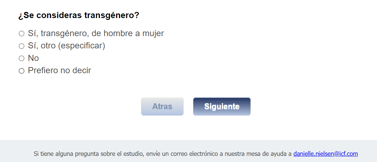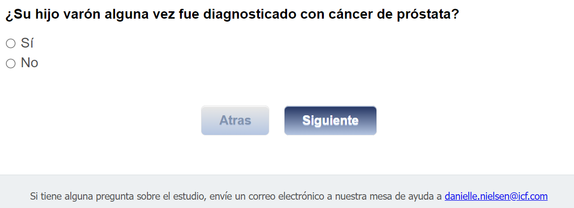 Footer Text: Si tiene alguna pregunta sobre el estudio, envíe un correo electrónico a nuestra mesa de ayuda a <danielle.nielsen@icf.com> |