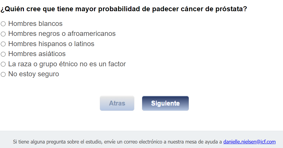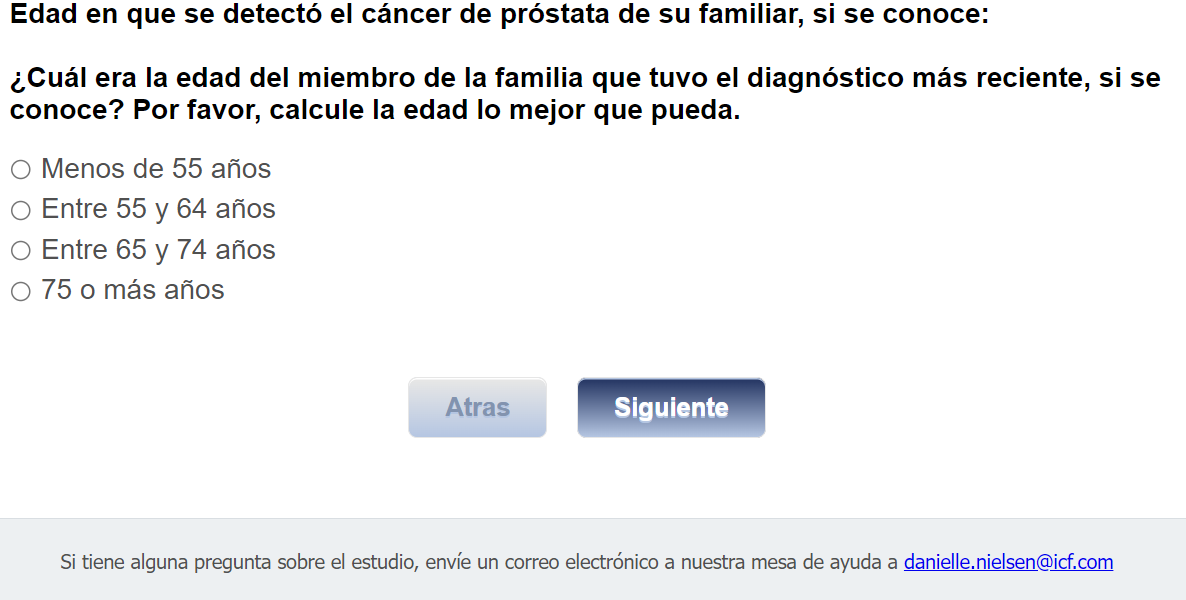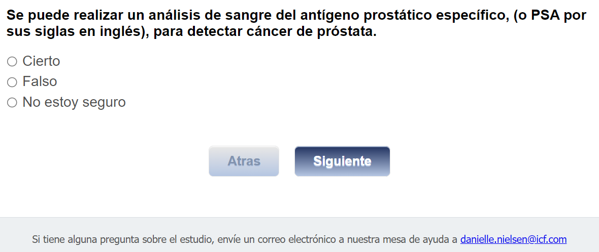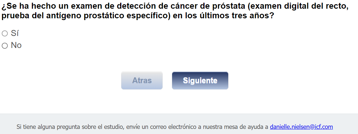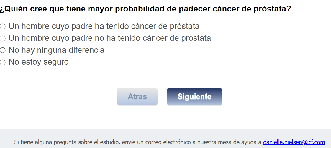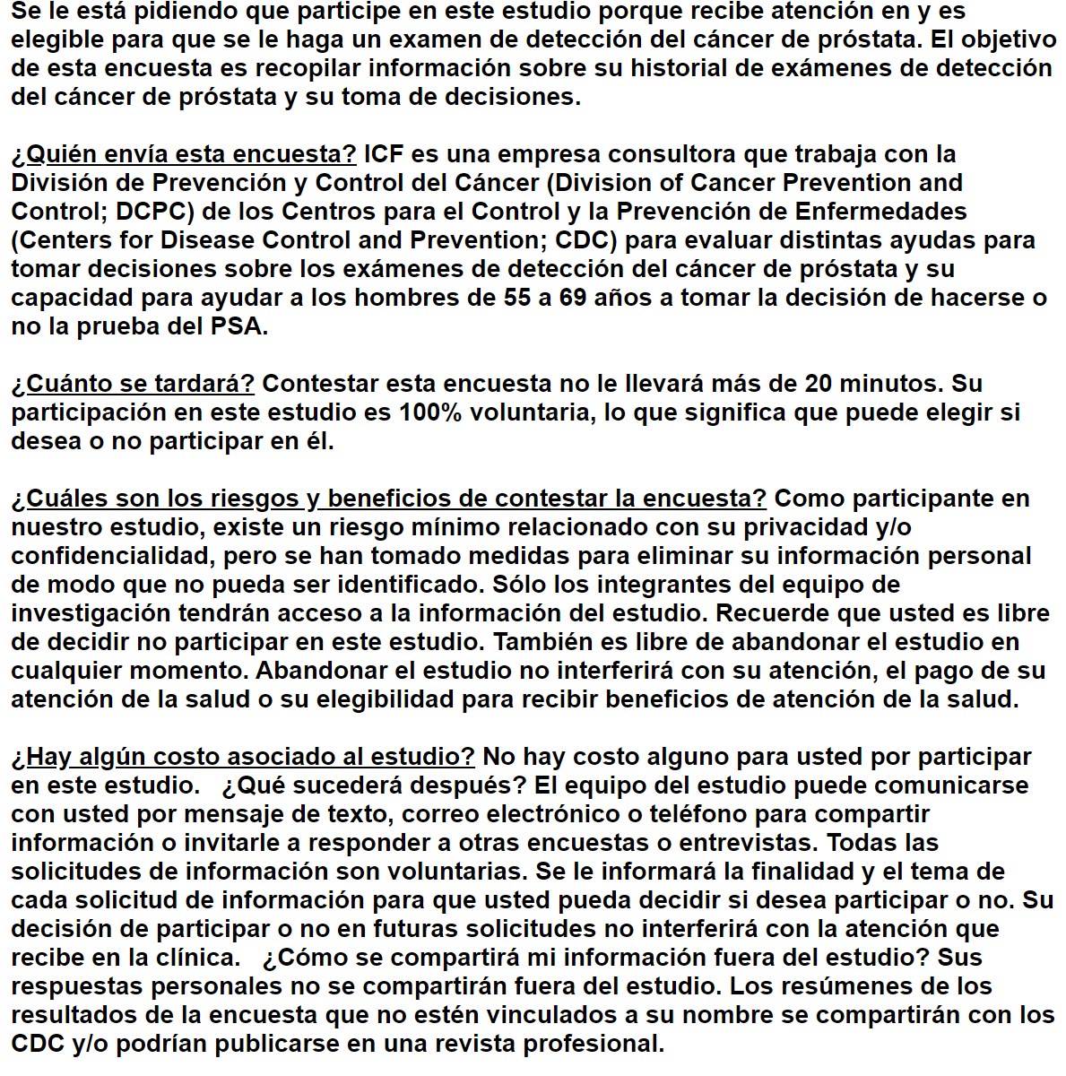 ¿Quién envía esta encuesta? ICF es una empresa consultora que trabaja con la División de Prevención y Control del Cáncer (Division of Cancer Prevention and Control; DCPC) de los Centros para el Control y la Prevención de Enfermedades (Centers for Disease Control and Prevention; CDC) para evaluar distintas ayudas para tomar decisiones sobre los exámenes de detección del cáncer de próstata y su capacidad para ayudar a los hombres de 55 a 69 años a tomar la decisión de hacerse o no la prueba del PSA.