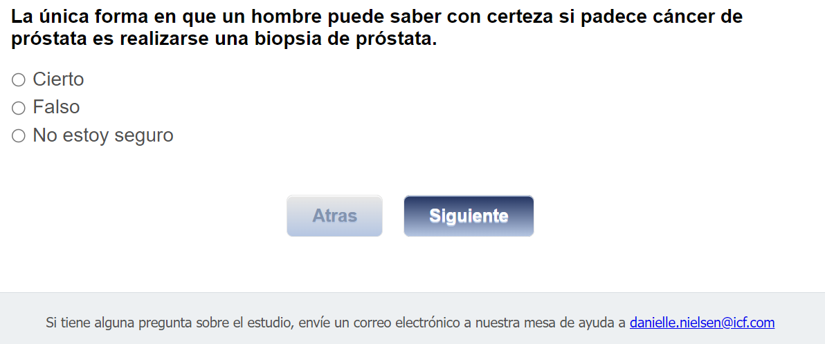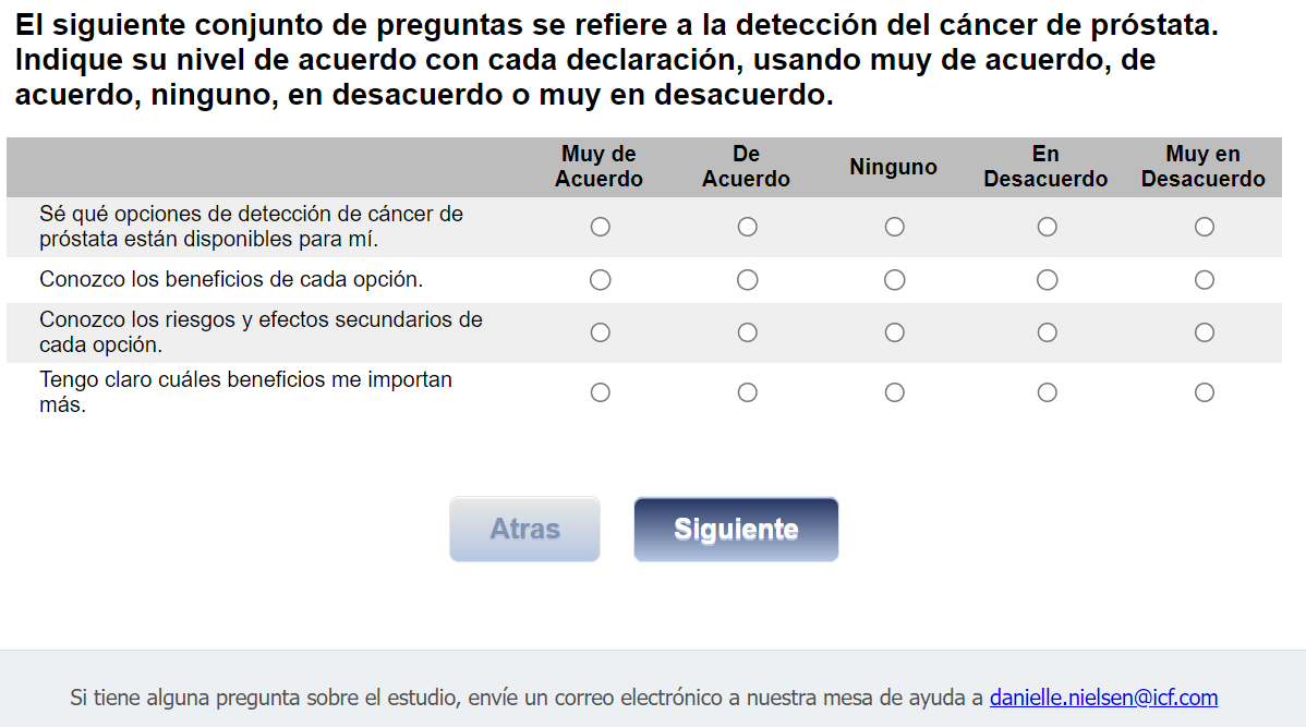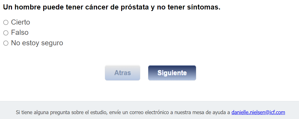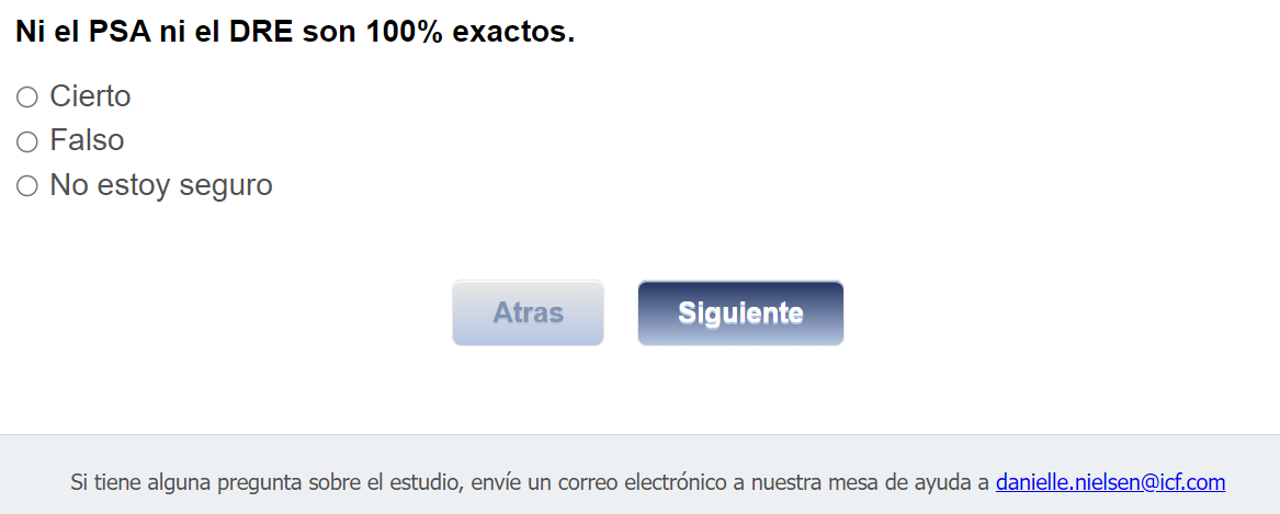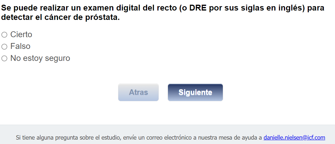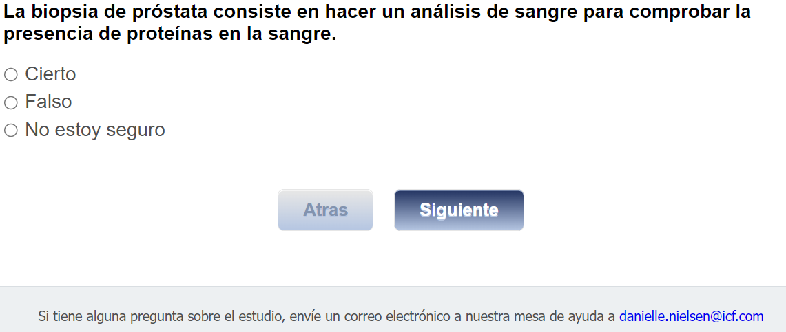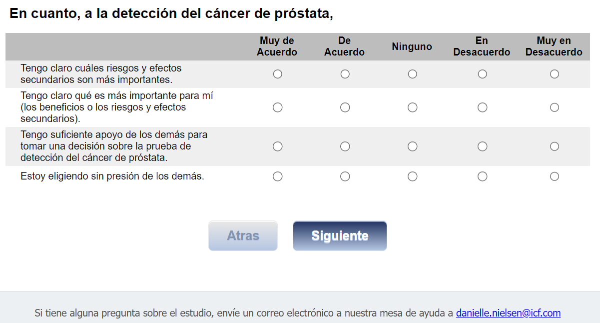 ¿Quién envía esta encuesta? ICF es una empresa consultora que trabaja con la División de Prevención y Control del Cáncer (Division of Cancer Prevention and Control; DCPC) de los Centros para el Control y la Prevención de Enfermedades (Centers for Disease Control and Prevention; CDC) para evaluar distintas ayudas para tomar decisiones sobre los exámenes de detección del cáncer de próstata y su capacidad para ayudar a los hombres de 55 a 69 años a tomar la decisión de hacerse o no la prueba del PSA.