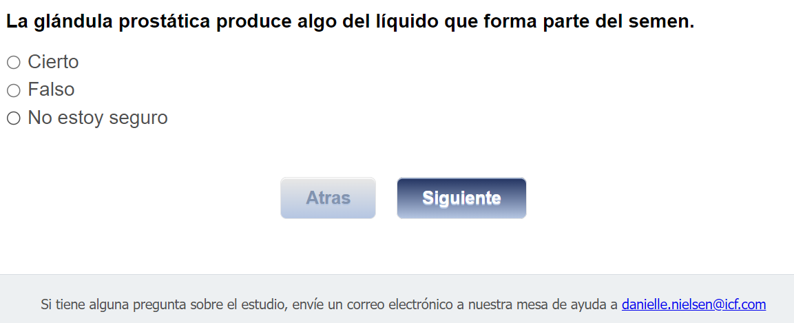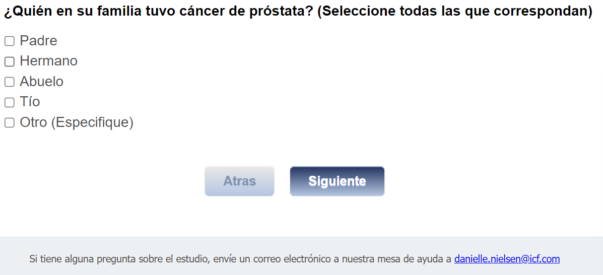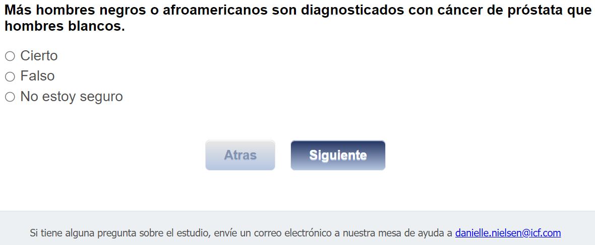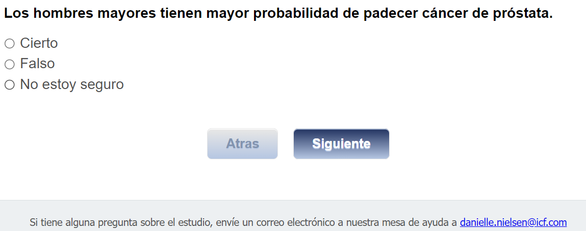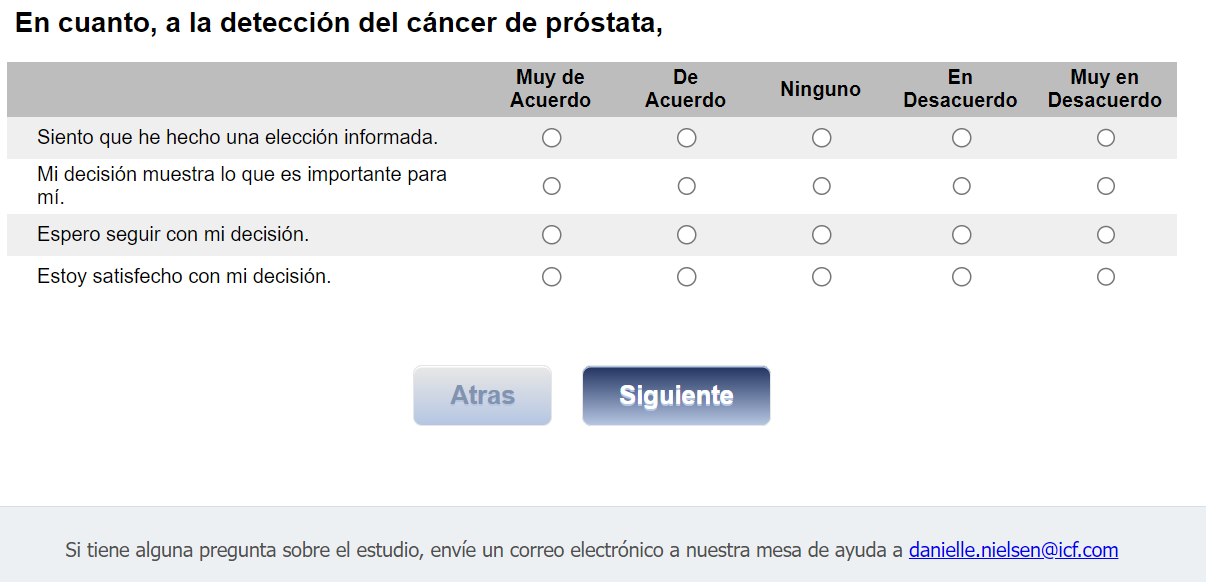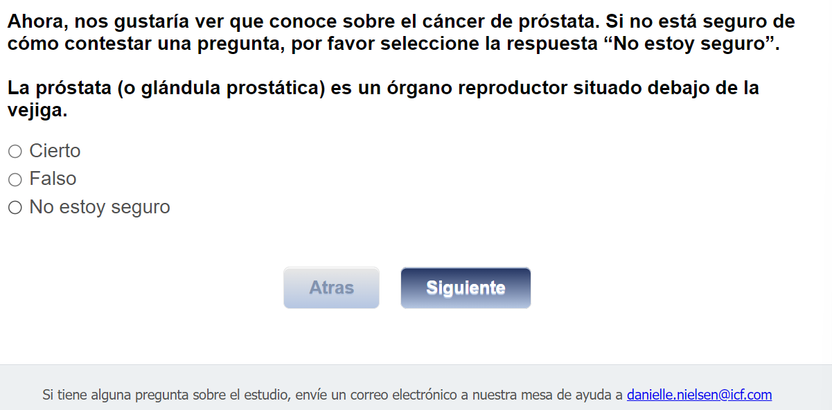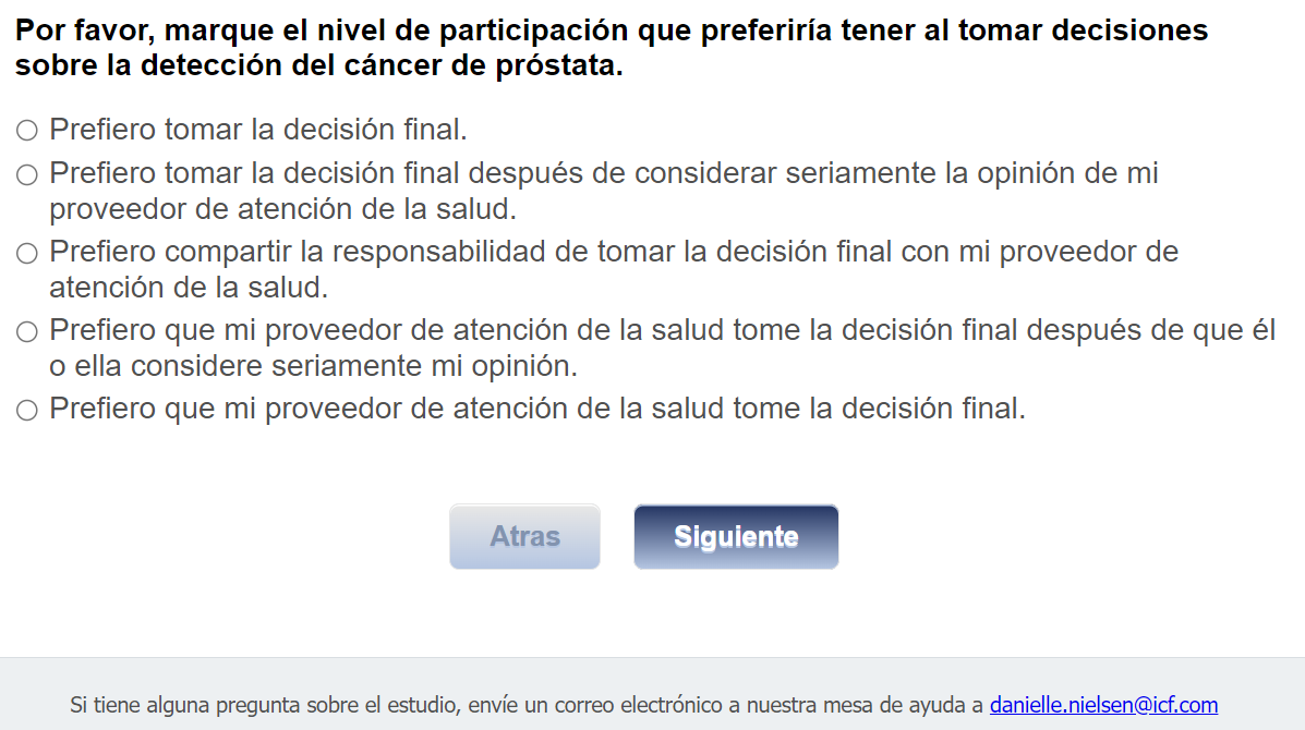 ¿Quién envía esta encuesta? ICF es una empresa consultora que trabaja con la División de Prevención y Control del Cáncer (Division of Cancer Prevention and Control; DCPC) de los Centros para el Control y la Prevención de Enfermedades (Centers for Disease Control and Prevention; CDC) para evaluar distintas ayudas para tomar decisiones sobre los exámenes de detección del cáncer de próstata y su capacidad para ayudar a los hombres de 55 a 69 años a tomar la decisión de hacerse o no la prueba del PSA.