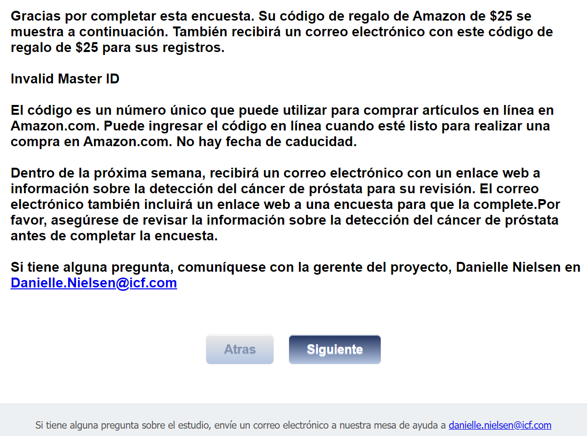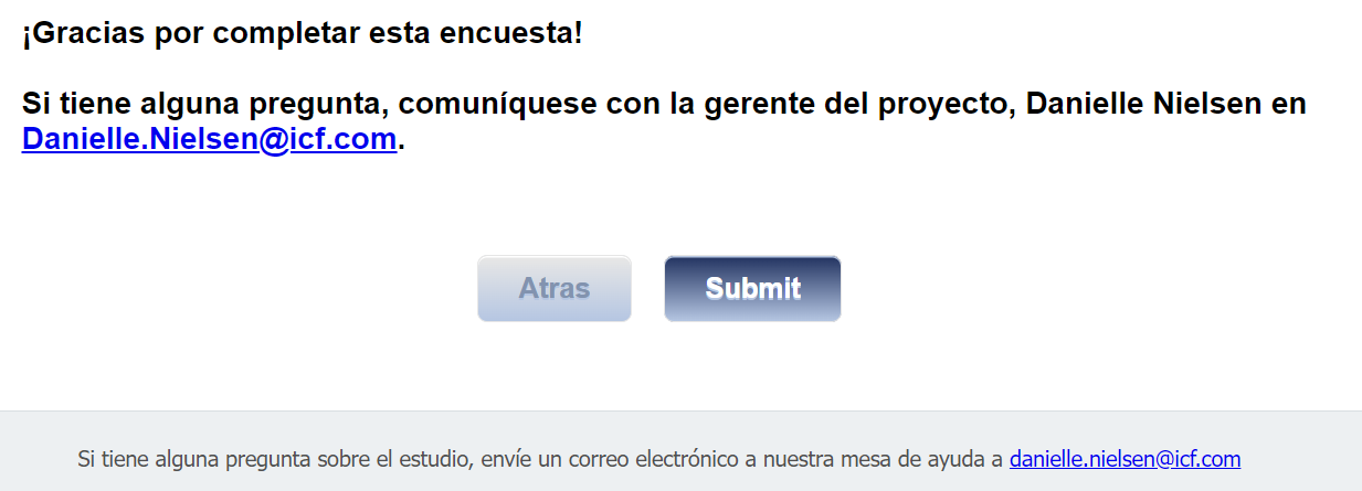 Survey Completion text: Gracias por completar la encuesta. Si tiene alguna pregunta sobre el estudio, envíe un correo electrónico al servicio de asistencia técnica de encuestas a <danielle.nielsen@icf.com>. |