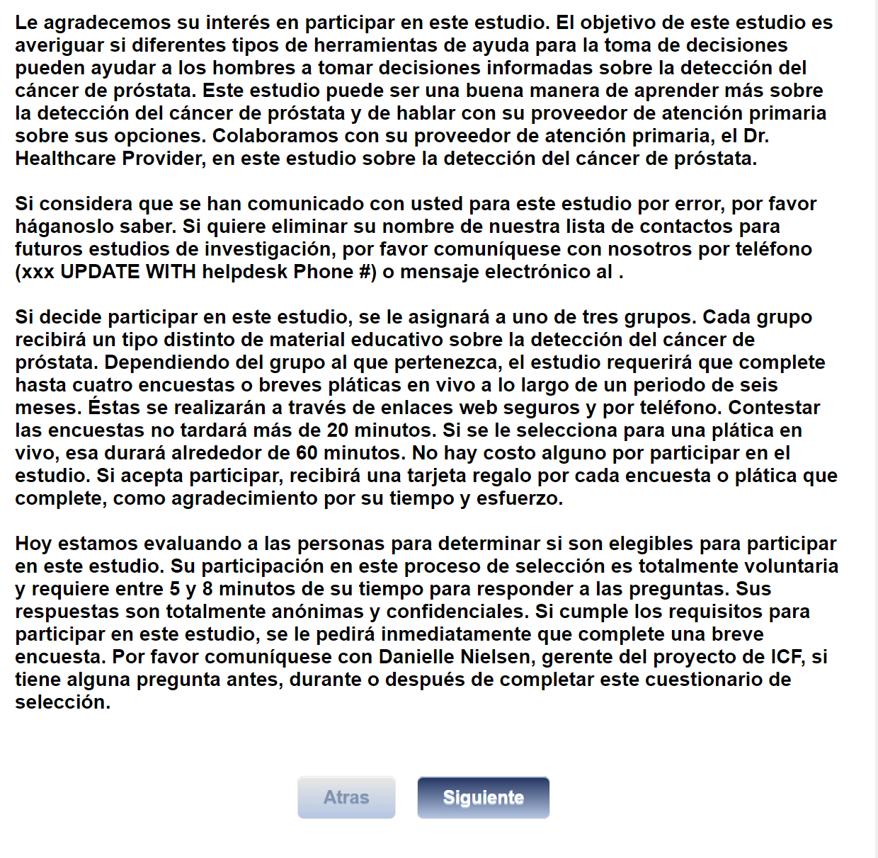Le agradecemos su interés en participar en este estudio. El objetivo de este estudio es averiguar si diferentes tipos de herramientas de ayuda para la toma de decisiones pueden ayudar a los hombres a tomar decisiones informadas sobre la detección del cáncer de próstata. Este estudio puede ser una buena manera de aprender más sobre la detección del cáncer de próstata y de hablar con su proveedor de atención primaria sobre sus opciones. Colaboramos con su proveedor de atención primaria, el Dr. [NAME], en este estudio sobre la detección del cáncer de próstata.