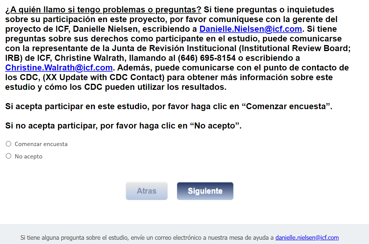 ¿A quién llamo si tengo problemas o preguntas? Si tiene preguntas o inquietudes sobre su participación en este proyecto, por favor comuníquese con la gerente del proyecto de ICF, Danielle Nielsen, escribiendo a Danielle.Nielsen@icf.com. Si tiene preguntas sobre sus derechos como participante en el estudio, puede comunicarse con la representante de la Junta de Revisión Institucional (Institutional Review Board; IRB) de ICF, Christine Walrath, llamando al (646) 695-8154 o escribiendo a Christine.Walrath@icf.com. Además, puede comunicarse con el punto de contacto de los CDC, (XX Update with CDC Contact) para obtener más información sobre este estudio y cómo los CDC pueden utilizar los resultados.