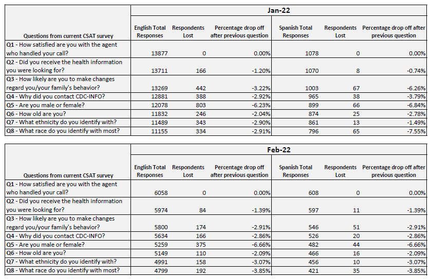 In addition, below is a table that shows drop-off rates for each consecutive question in the phone/IVR survey. Ethnicity and race questions, in that order, are the last two questions in the survey. As you can see from the table, in January, for example, total of 5.7% of respondents that answered the previous question dropped off as the race and ethnicity questions were asked (English survey). In February that number was 6.8%. Comparative drop-off rate for all demographic questions (sex, age, ethnicity, race) were 13.4% in January and 14.8% in February. For the 3 non-demographic questions (Q2-Q4), total drop-off was 7.34% in January and 7.16% in February. These numbers do not necessarily demonstrate that there is excessive or uneven drop-off due to the nature of the ethnicity and race questions.