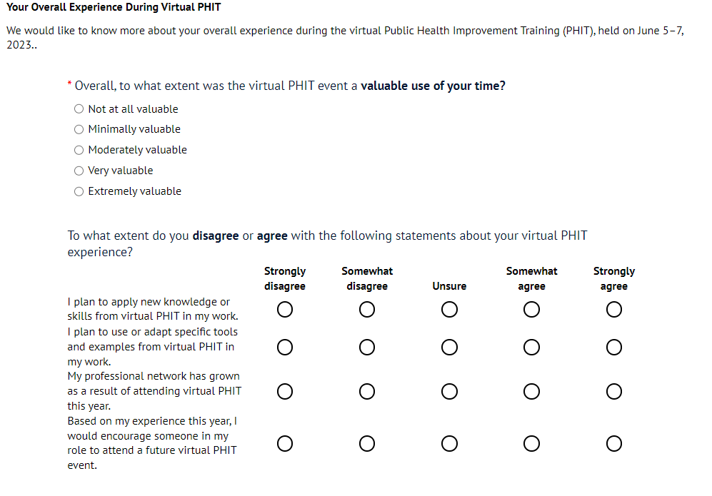 We would like to know more about your overall experience during the virtual Public Health Improvement Training (PHIT), held on June 5–7, 2023.