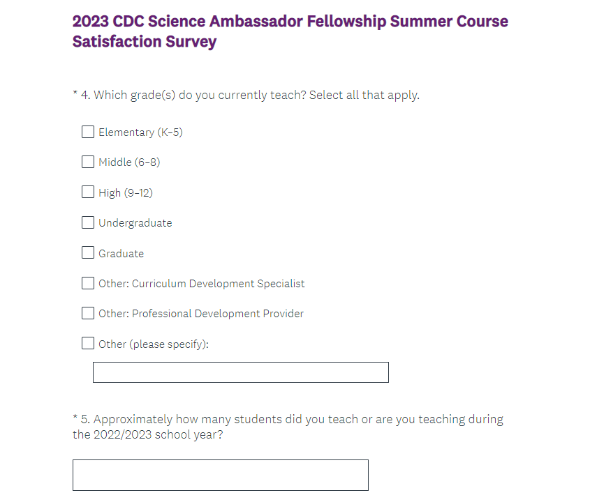 Attachment 2. 2023 CDC Science Ambassador Fellowship Summer Course Satisfaction Survey Screenshots