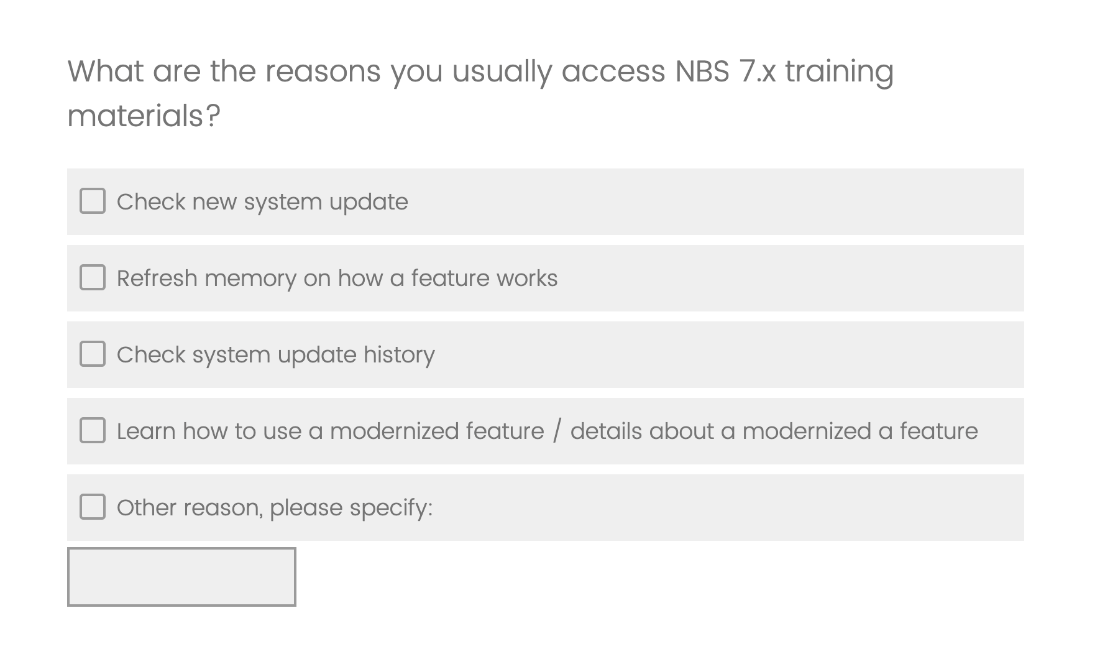 As part of our ongoing efforts to enhance the usability and accessibility of NBS, we are conducting a survey to gather insights into your preferences for user training materials for NBS 7.x new releases.